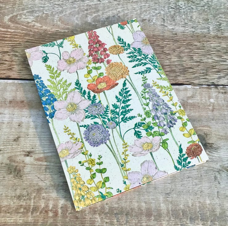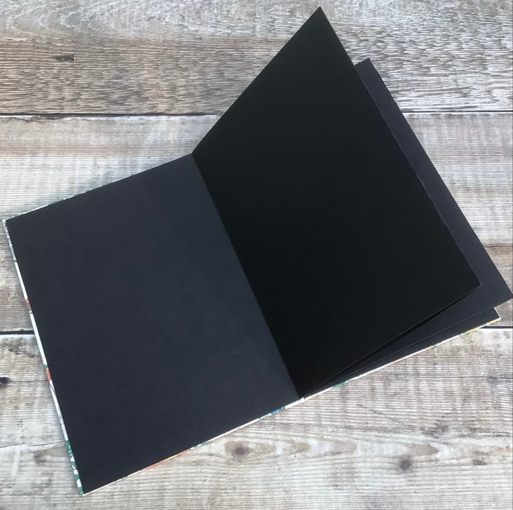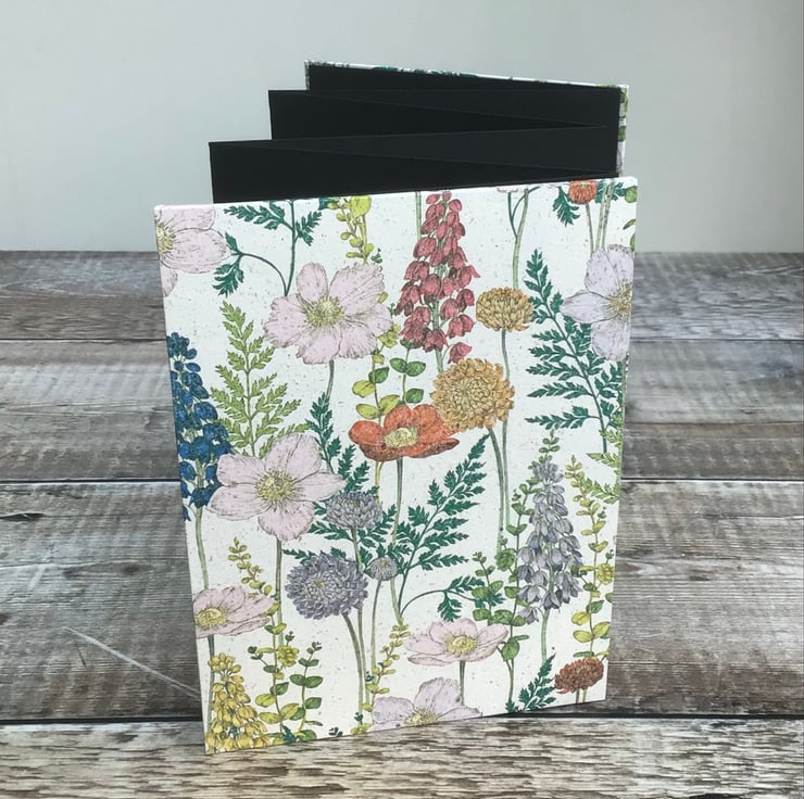 This concertina photo album has 12 panels of 270gsm black, acid free card and is covered with a beautiful, sustainable grass paper depicting garden flowers. It is tied with a black grosgrain ribbon which unties easily and can be used as a secure closure for transportation simply by retying.