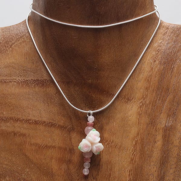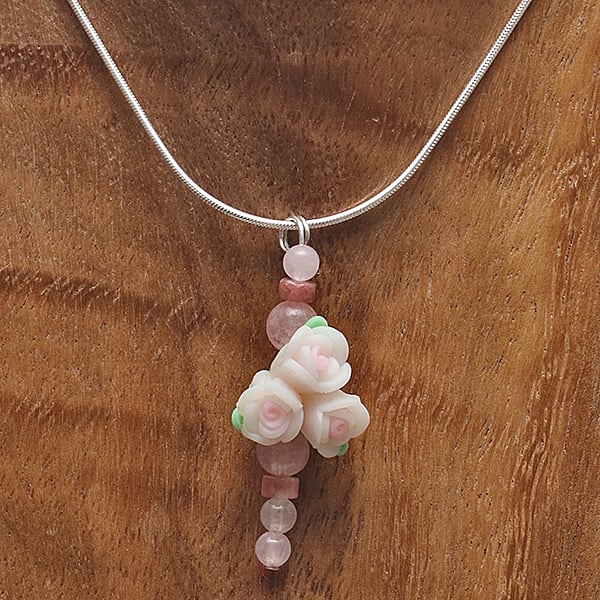 Again, the combination of the Rose Quartz and Rhodonite with the Pastel Pink Polymer Clay triple Rose central bead, has created a sensitively striking pendant.