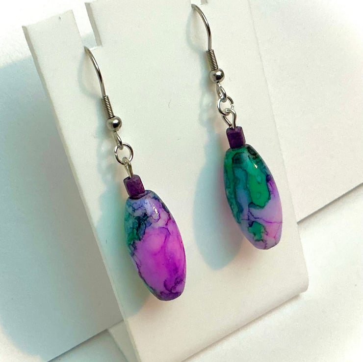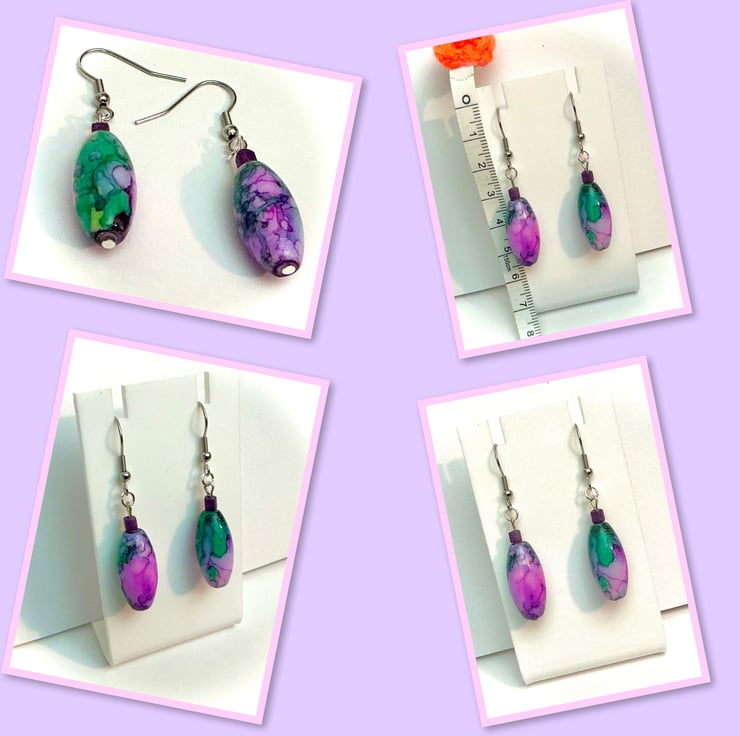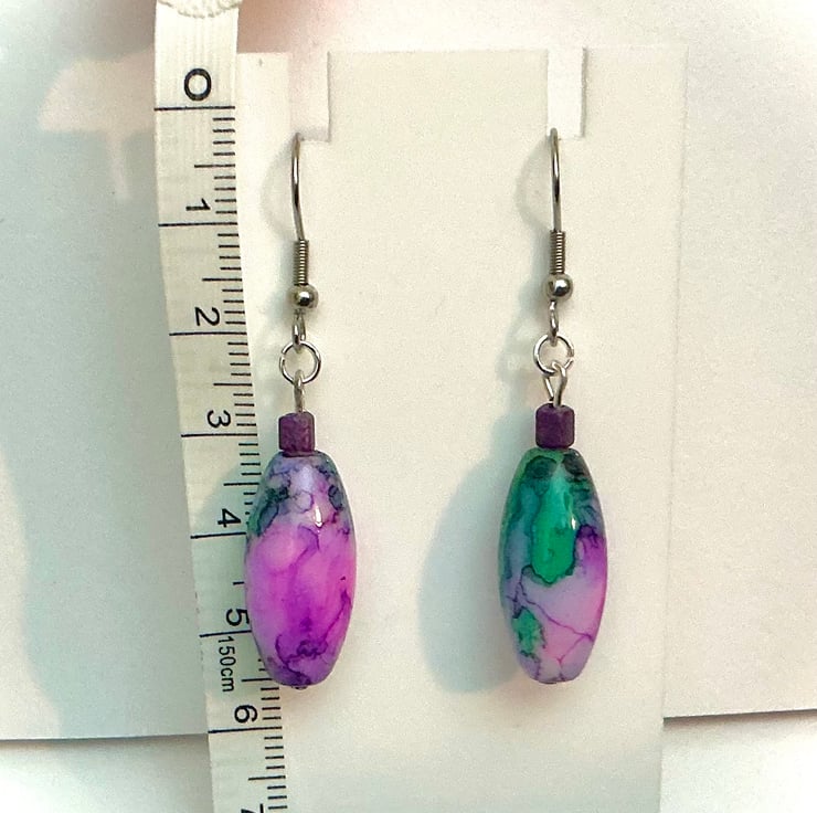 Dangly earrings in pretty shades of Pink, Purple and Green made using patterned, oval shaped glass beads. Check the photos for drop length.