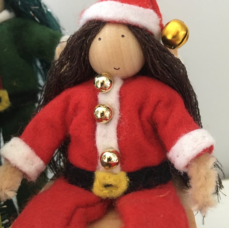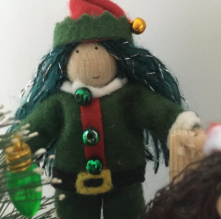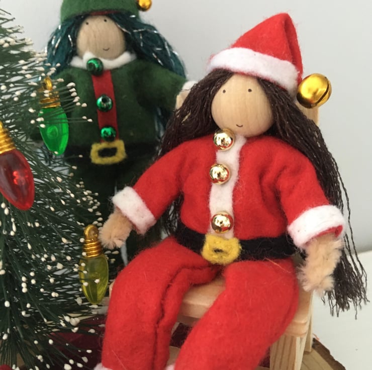 The elf has sparkly wool hair, and the Santa has sparkly embroidery thread hair. Their bodies are pipe cleaners, and their heads wooden beads with carefully hand drawn features.