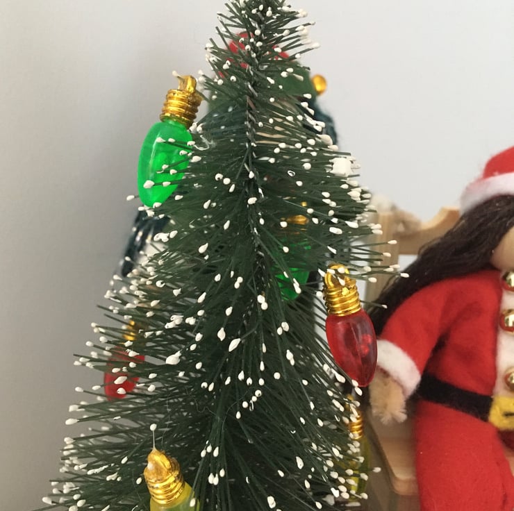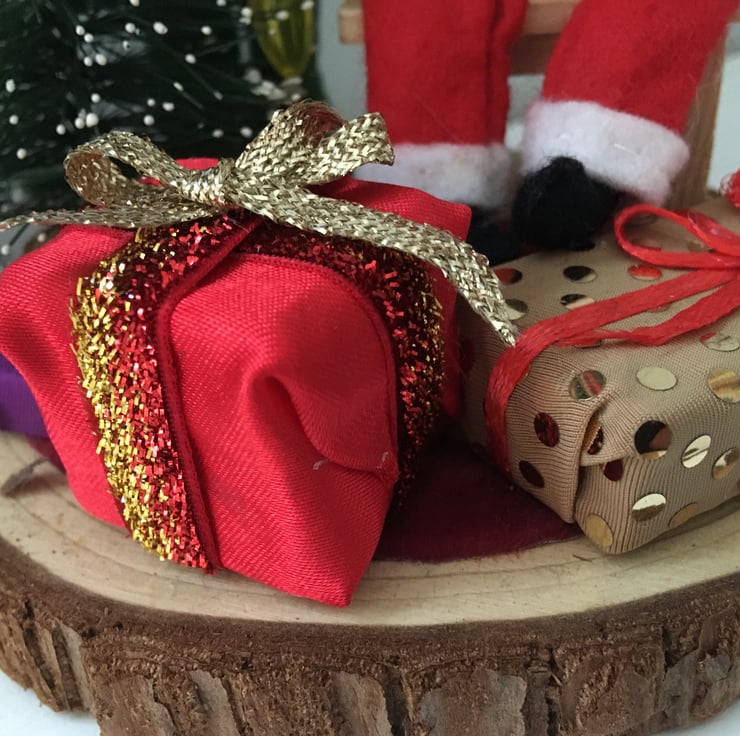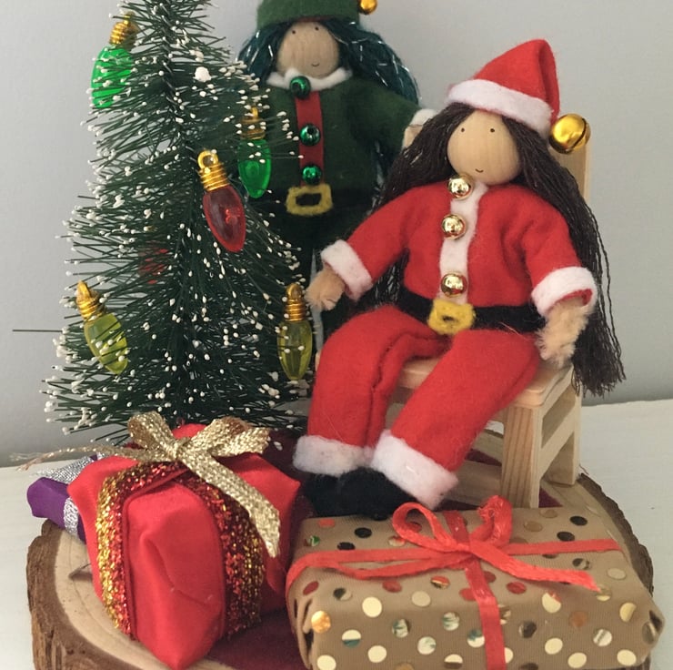 This is a lovely little Christmas scene with a little Santa and elf person. The little peoples outfits are made from felt, with sparkly beads along the front. At the end of their felt hats their are tiny jingly bells. (There are also tiny bells at the end of the elf's shoes.)