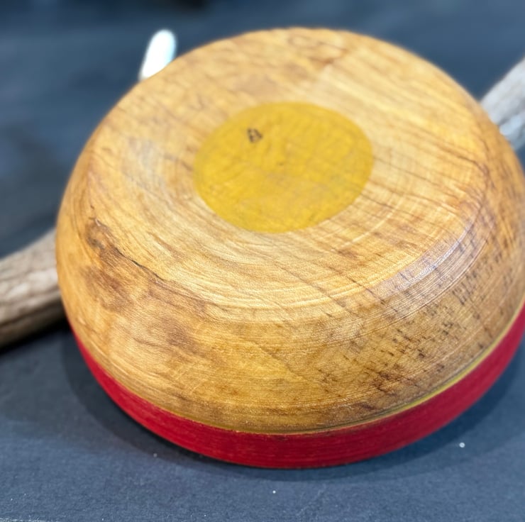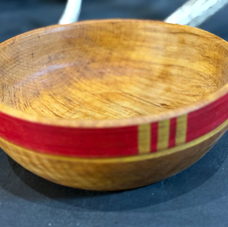This is a large pole-lathe turned, Sycamore wood, eating bowl with enough volume to also be used to serve a side. It has a bright red coloured painted rim with yellow stripes and a yellow base, all in food safe milk paint. Wooden bowls are perfect to pair up with a wooden eating spoon, and can be used for many different uses, be it hot or cold. This bowl is bright but with rich wood colours and is sure to be a winner on any dinner table. It’s max dimensions to rim are 175x60mm.