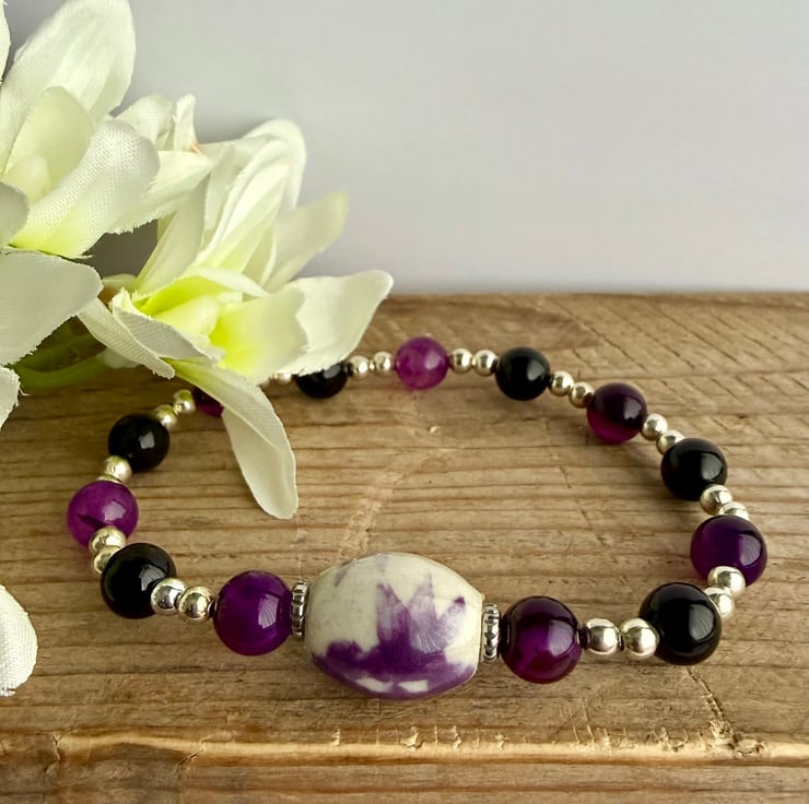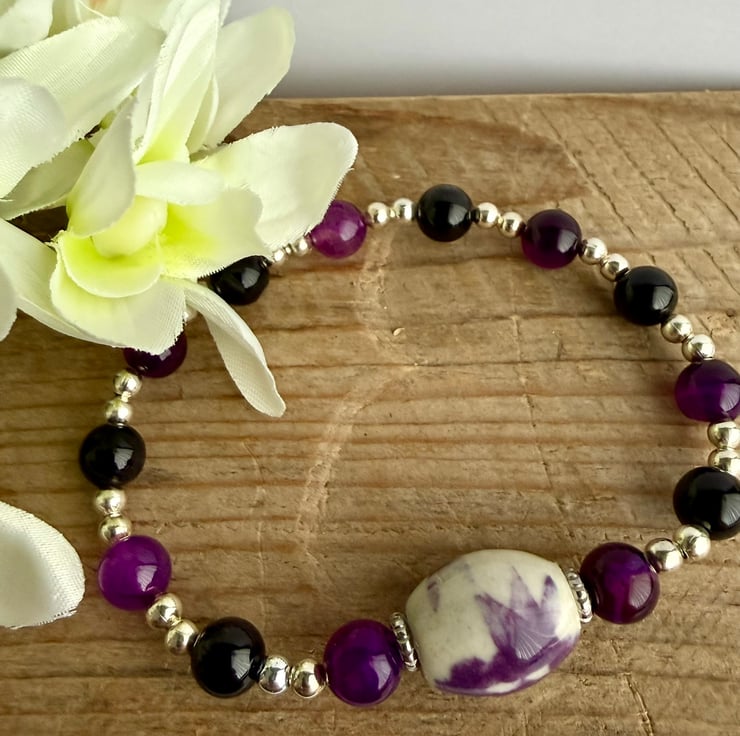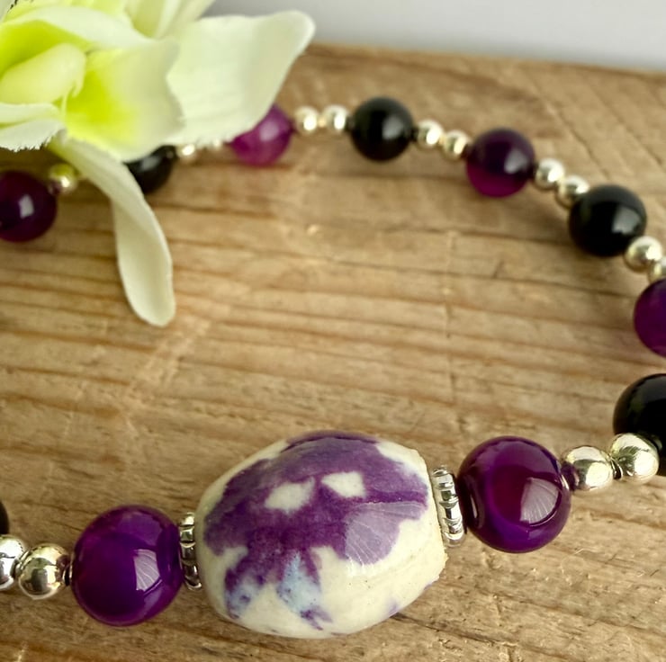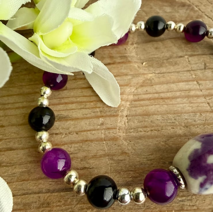 Handmade stretch bracelet with a pretty white central porcelain bead with purple flowers and slight hints of blue detail. The rest of this unique bracelet is made up of deep purple almost black and a lighter lavender tone of beautiful Agate. Silver plated and stainless steel spacers.