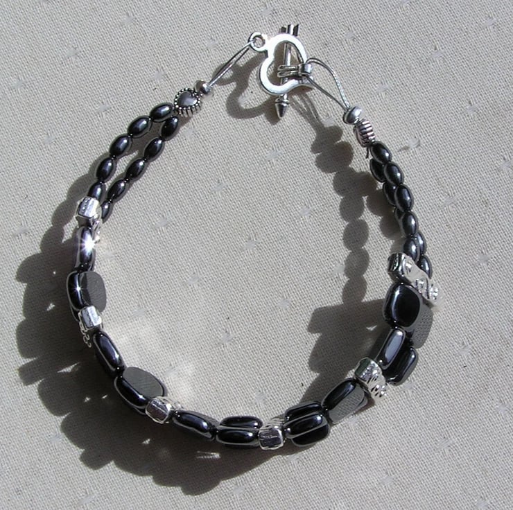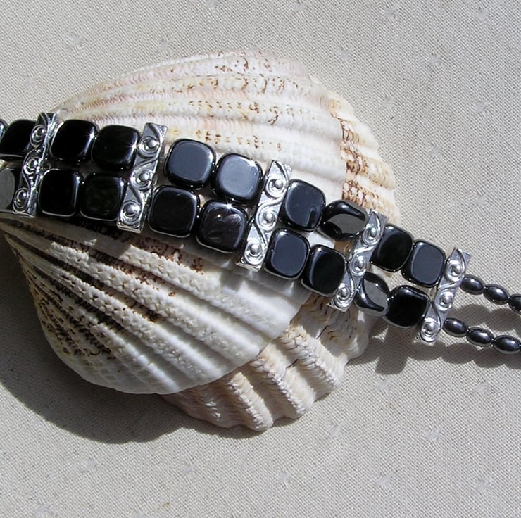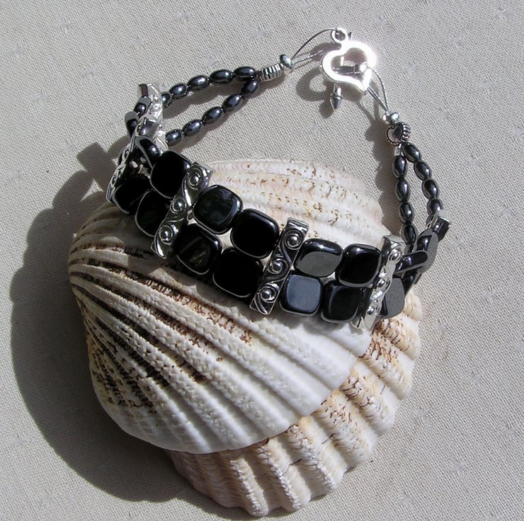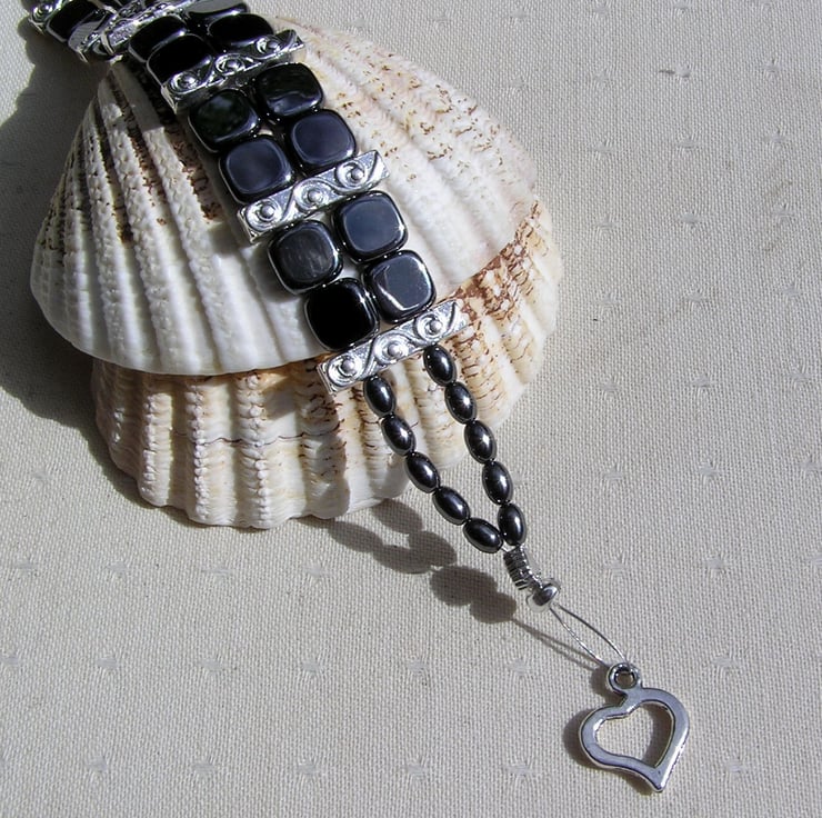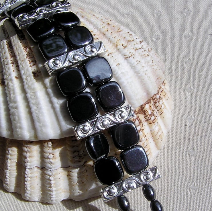 This Stunning Bracelet is made wholly from Hematite... Square beads & contrasting Barrel shaped beads… each section separated by an ornately decorated Tibetan Silver Bar Spacer with a tiny Silver Heart at each end - a Beautiful Gothic combination that will look stunning either worn casually or with something more Elegant for a Special Evening out