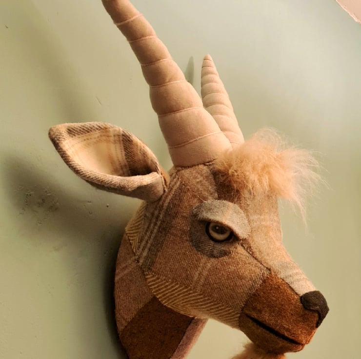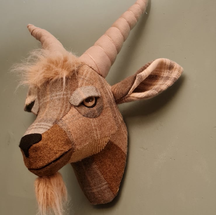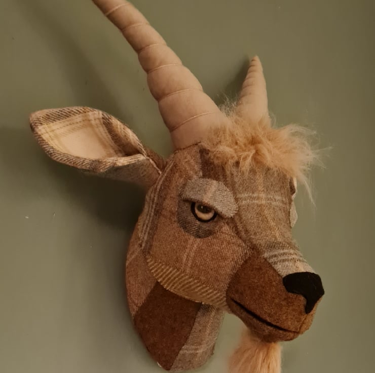 A slightly larger than lifesize fabric goat head hich I have handmade and covered in a hand stitched patchwork of wool tweed and tartan with velour horns. His fringe and beard are cream long pile faux fur.