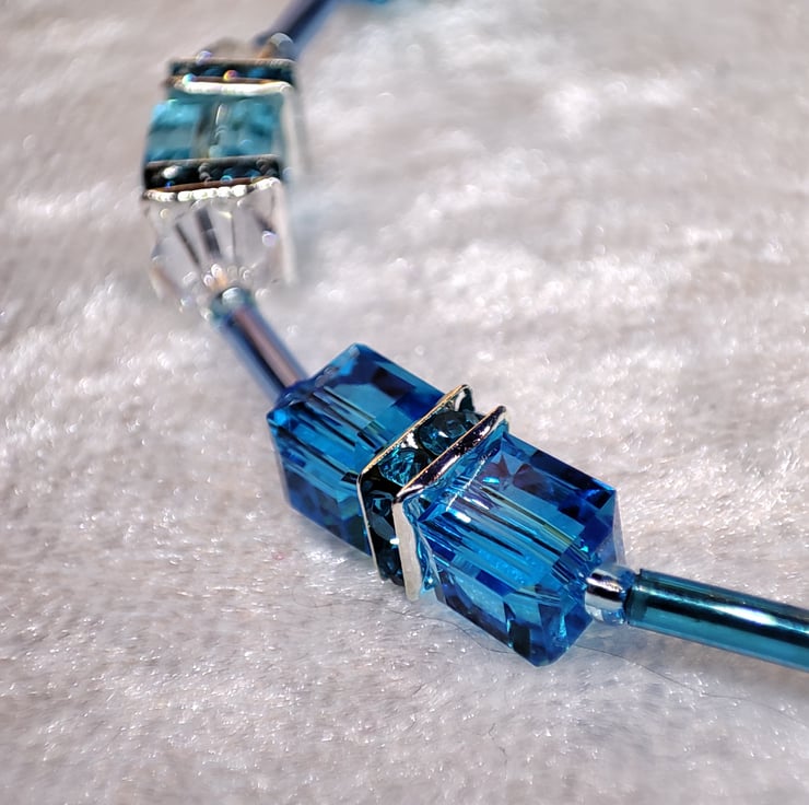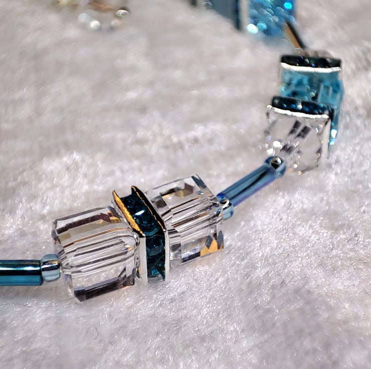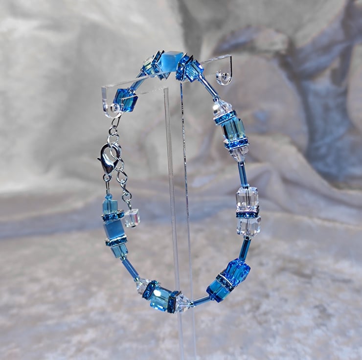 Handmade crystal and silver plated bracelet. I chose the colours of the season, winter, for this one. The mixture of icy crystal and blue reminds me of the cold, bright sunny days in winter. 18cm from the clasp to the start of the extender chain.