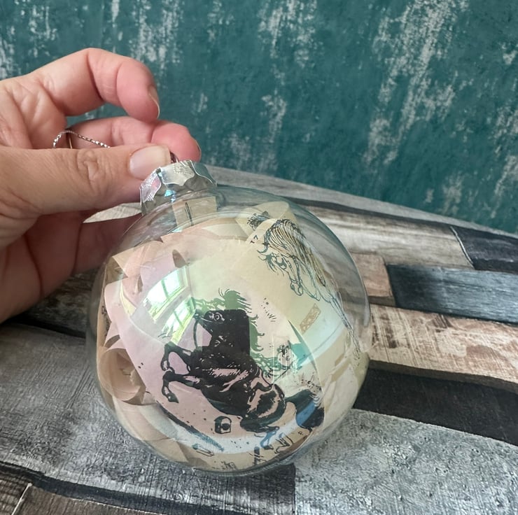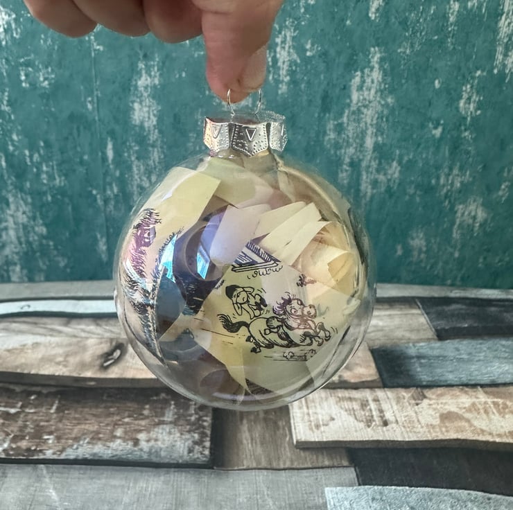 This bauble is filled with strips from an upcycled childrens book based on Thelwell ponies.