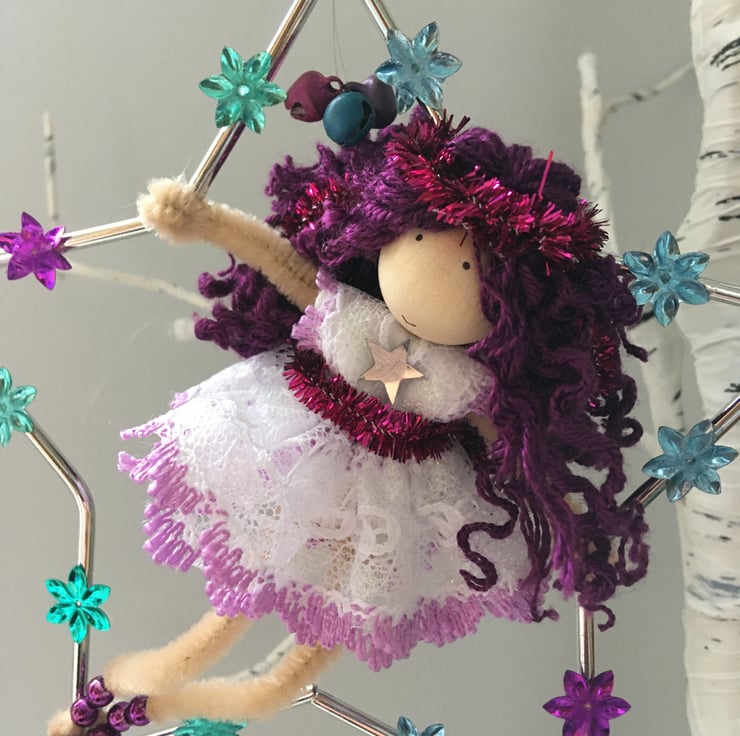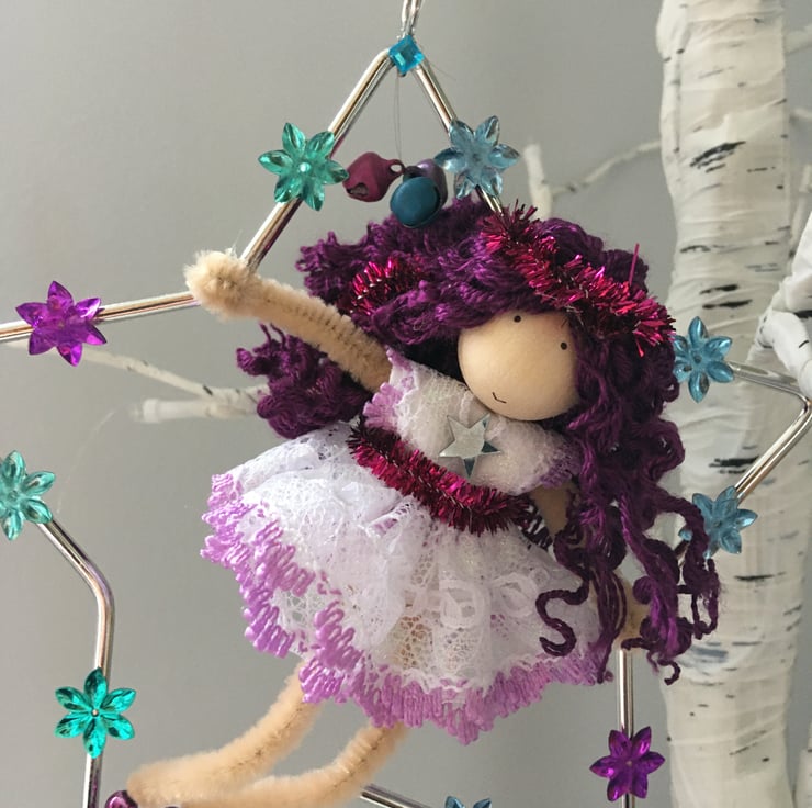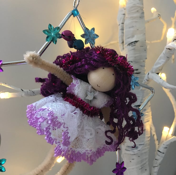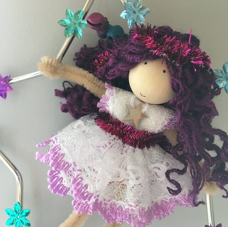 This little fairy has a pipe cleaner body, with a dress made out of fabric and lace. The front of her dress is embellished with a sequin. She has sparkly pipe cleaner wings, and a sparkly pipe cleaner halo. She has curly wool hair, and bead shoes. Her head is a wooden bead with carefully hand drawn features.