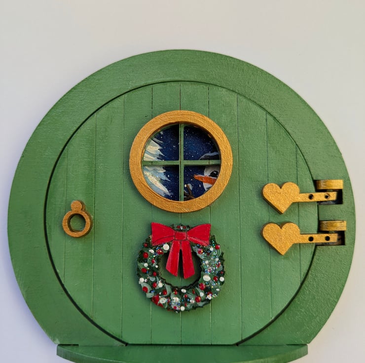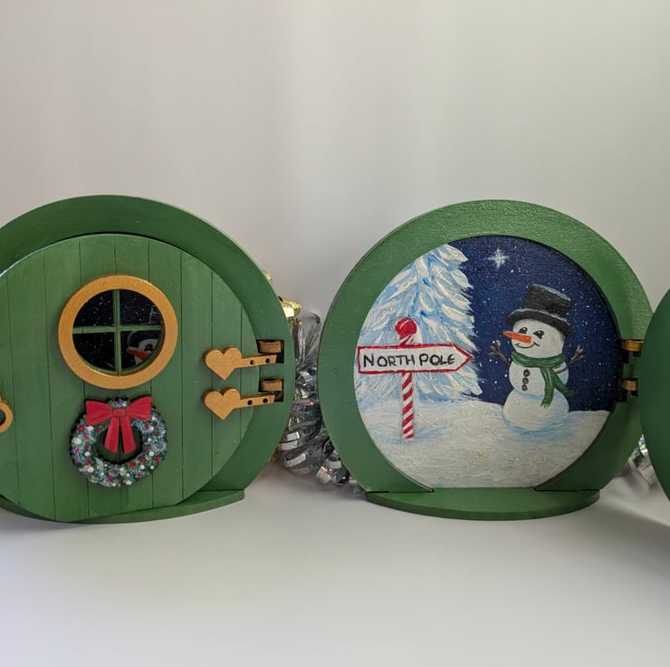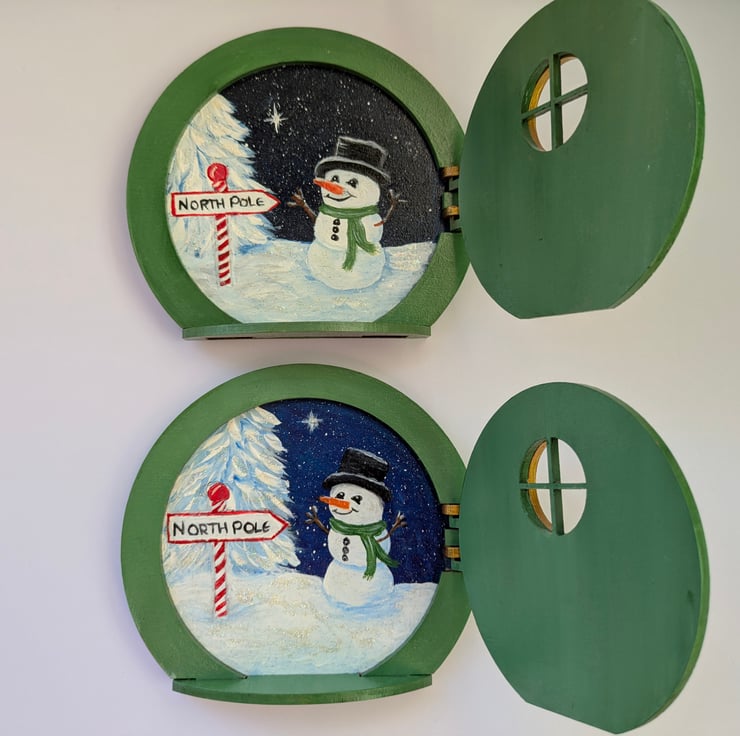 These wooden elf doors are just a little bit special -they take you to the North Pole! Open the door and inside there is a friendly snowman waiting to guide the way!