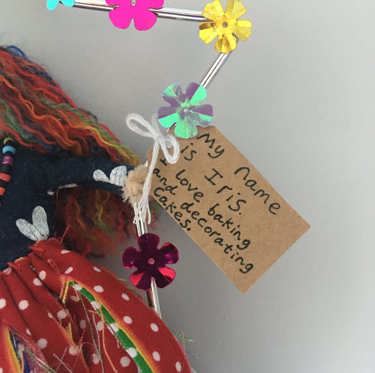 She has a tag which states her name and something that she loves. She is called Iris, and she love baking and decorating cakes.