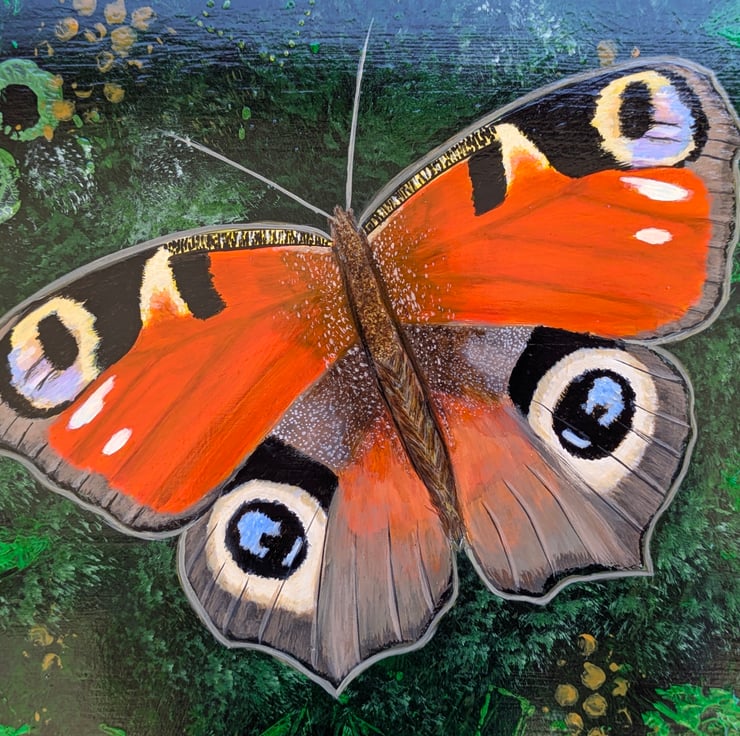 Peacock Butterfly with an abstract background, hand painted by myself Jennifer Hunter.