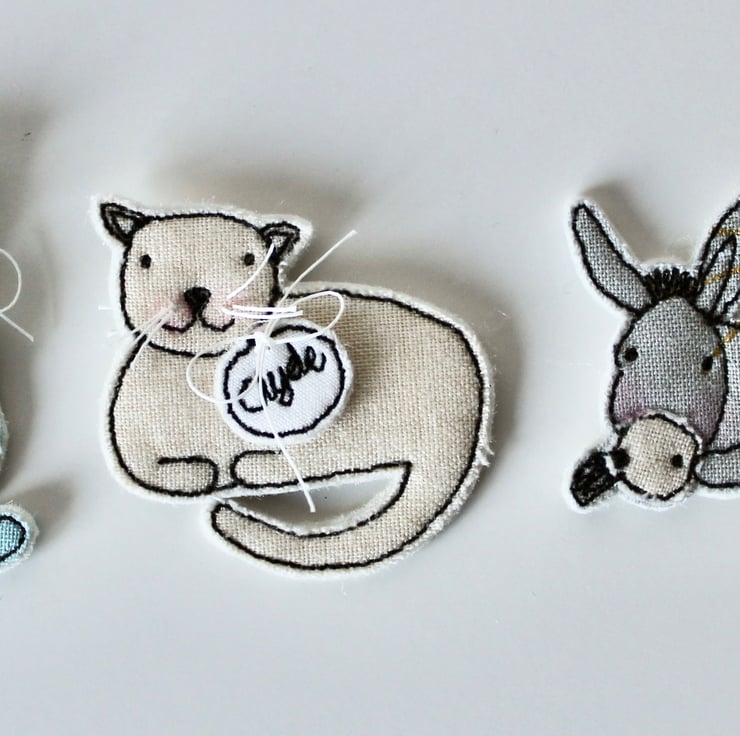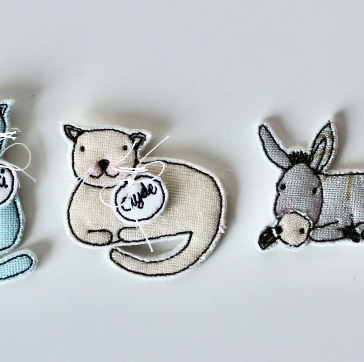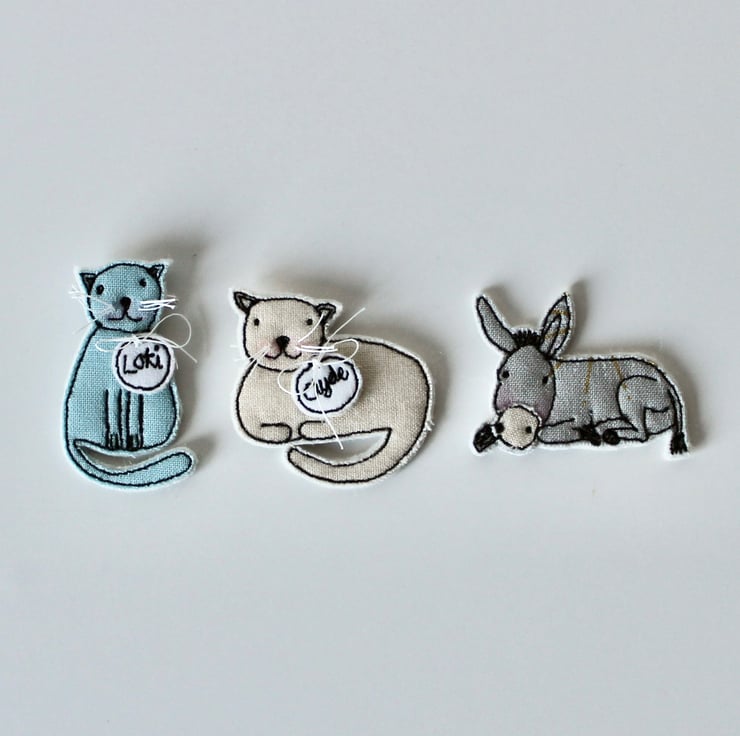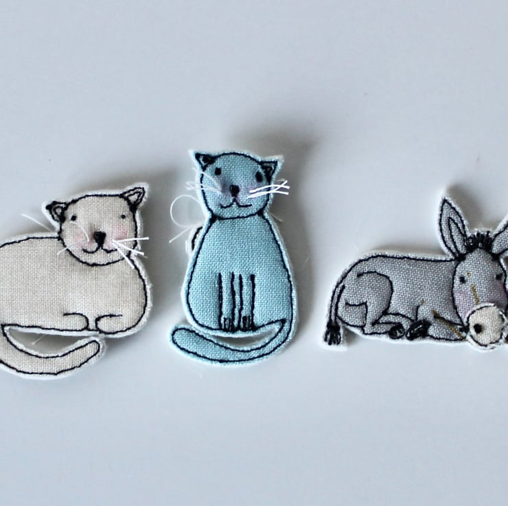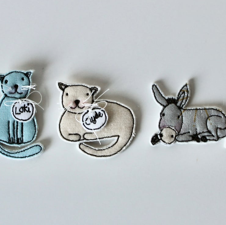 Two cats and a donkey are created using 100% wool felt, cotton cloth, free hand machine embroidery and are cut out by hand, using a very sharp pair of scissors.