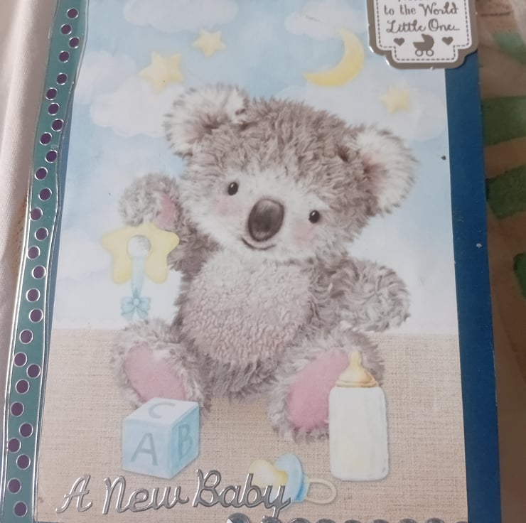 The teddy bear greeting card has a greeting of Welcome to the world, little one. A cute teddy bear with baby accessories and gems has an envelope and is wrapped for protection