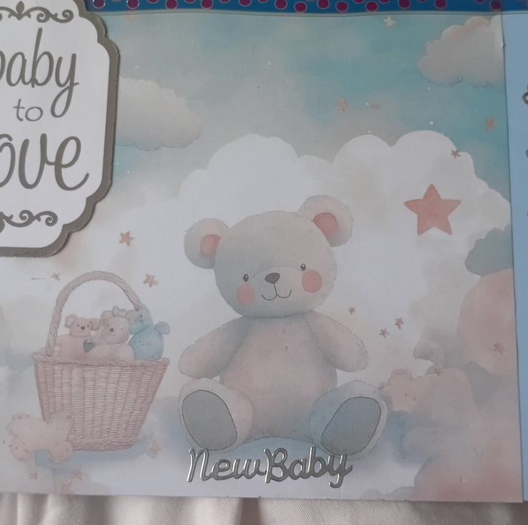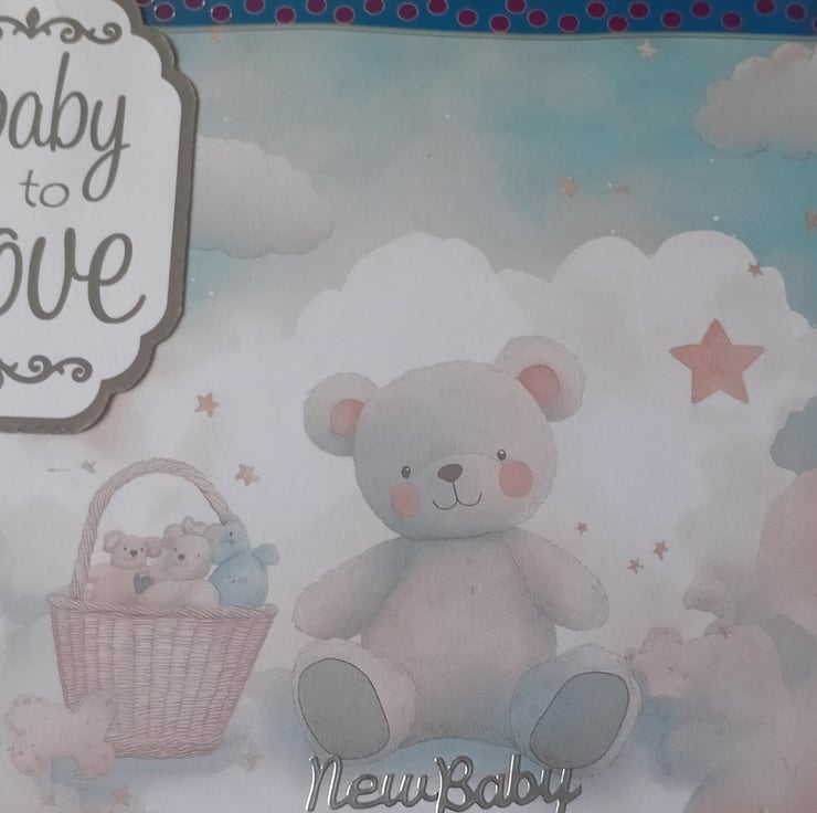 A cute teddy bear with a basket of teddy bears has a greeting for a new baby to love, including an envelope and wrapped for protection