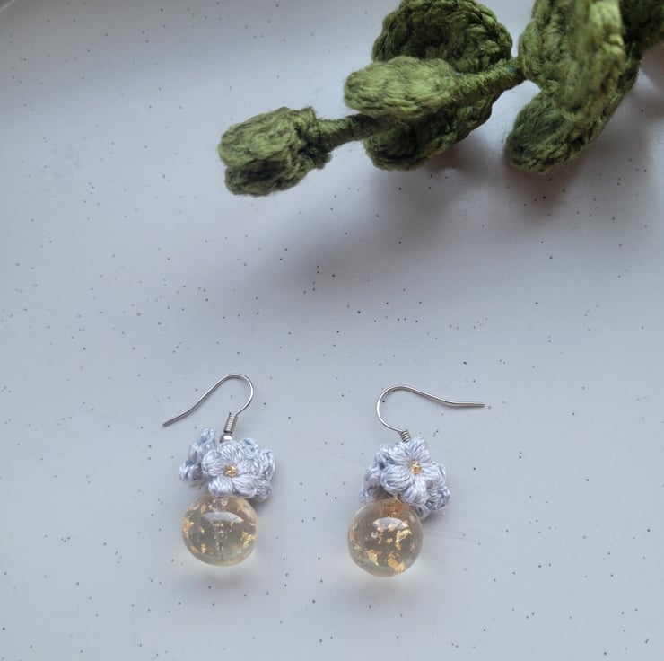 Moonpetal Grey Crochet Flower & Gold Flake Resin Earrings