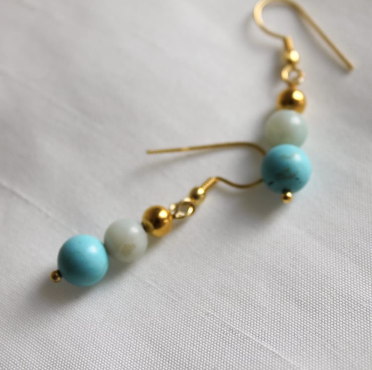 Elegant and simple beaded dangle earrings, made with natural gemstones - amazonite & howlite beads in turquoise and light blue, Sterling 925 Silver gold plated beads, earhooks and wire