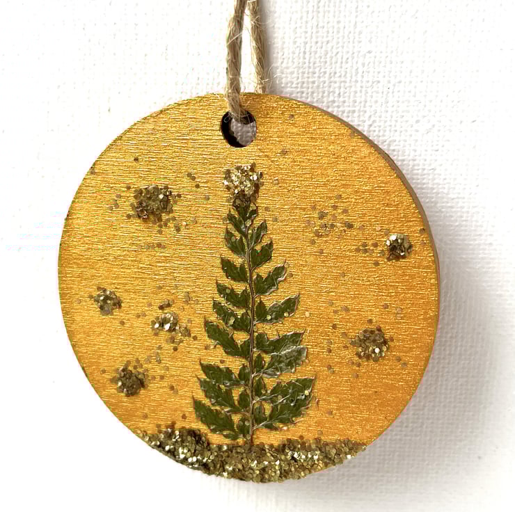 Hand painted and pressed fern wooden Christmas tree decoration. This piece is painted using artist acrylics and decorated using a real pressed ferns grown in our garden. This piece is decorated on both sides and finished with of biodegradable glitter.