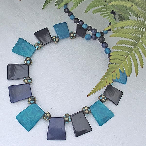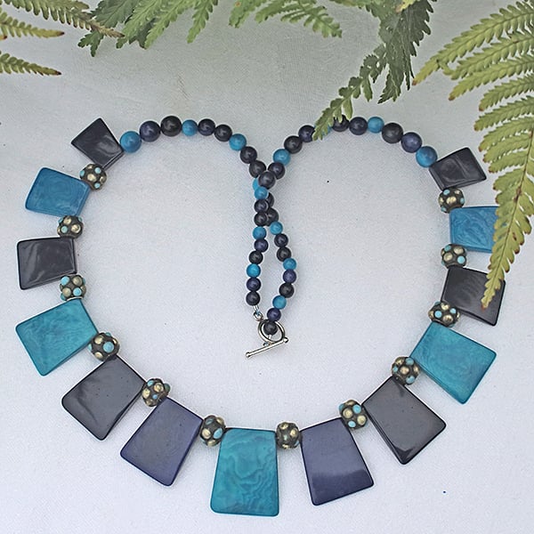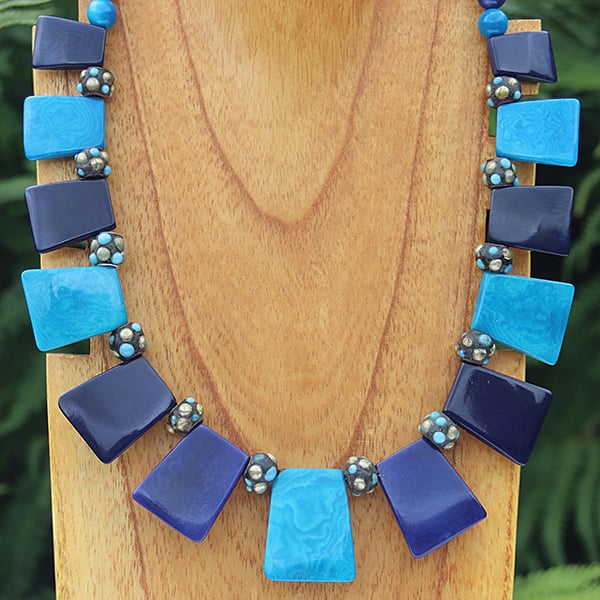 In the Fan Necklace collection, I have combined some upcycled vintage North African beads with an array of blue coloured Tagua Seed beads.