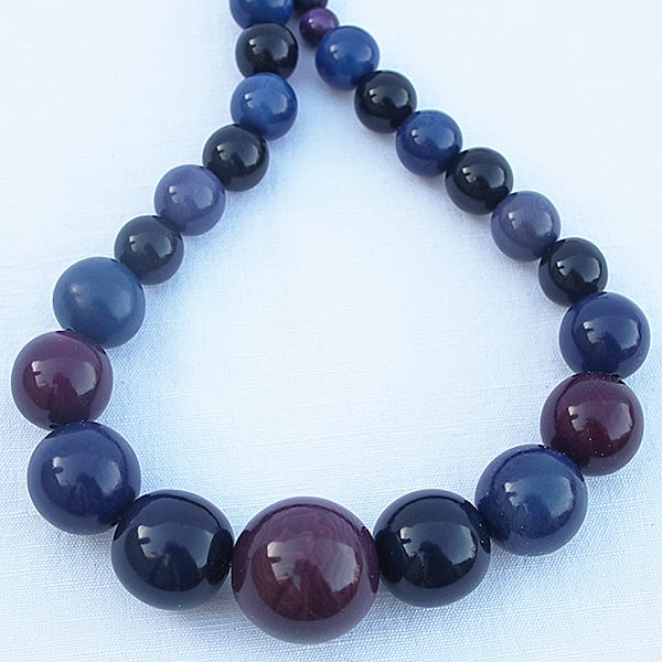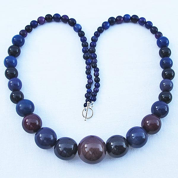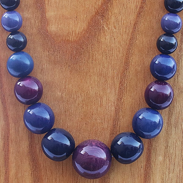 Using the blue colours to frame the rich purple coloured round Tagua Seed beads.