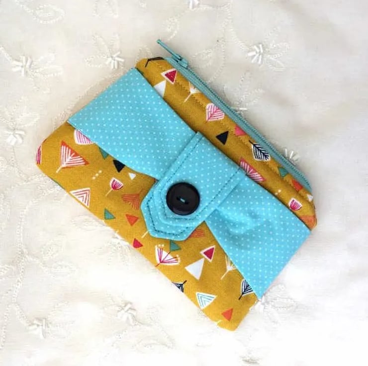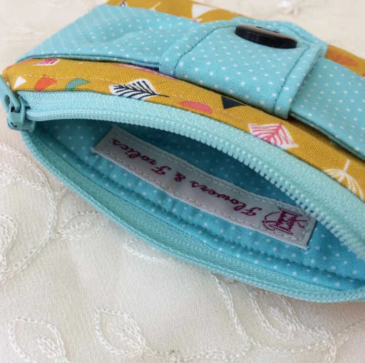 I have made it in a mustard fabric with geometric flowers in turquoise, white, dark blue, orange and pink. I have made the bow and lining in a co-ordinating turquoise fabric with little white spots. The pouch closes with a matching turquoise zip and the bow is finished with a co-ordinating dark blue button.