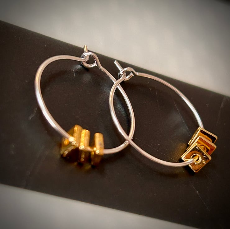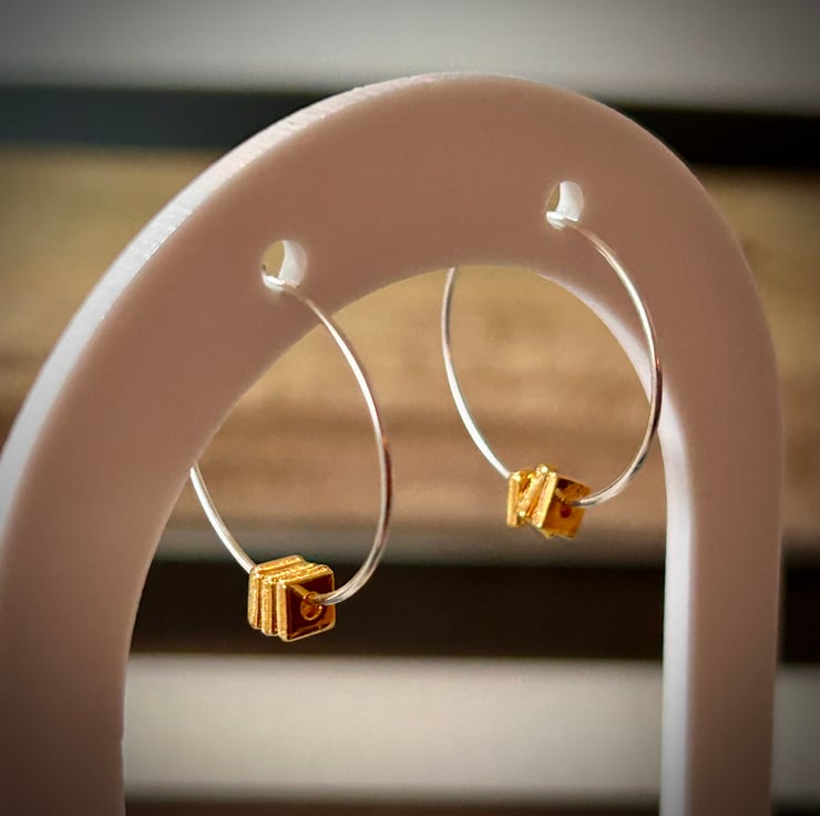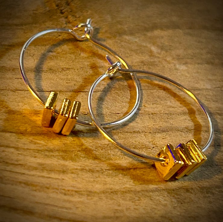 These elegant handmade hoop earrings feature three little gold metal squares.