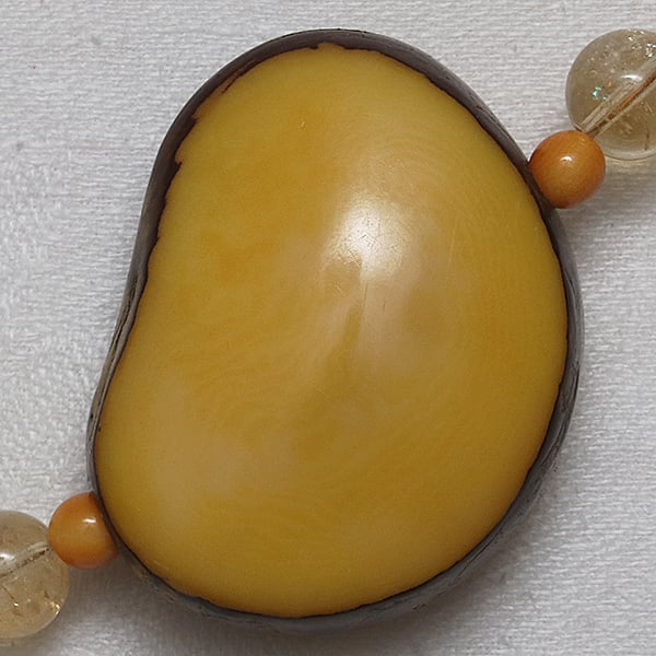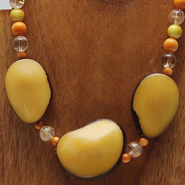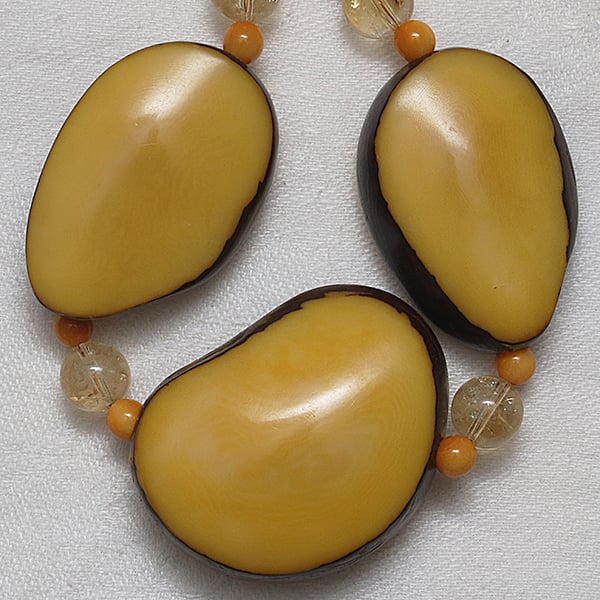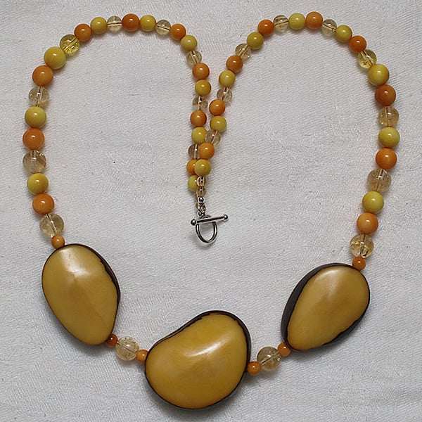 I don’t often use the yellow coloured Tagua Seed beads as the central beads. But here I found the three I chose had a bold shape and appearance to them that in combination with the round Citrine and Tagua beads made a beautiful and, again, light in weight for its size.