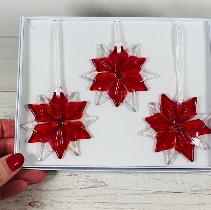 Gorgeous fused glass Christmas snowflakes/flowers created using irridescent glass and gorgeous cranberry glass. . The gift box contains 3 decorations - each approximately 2.5 inches. In a quality white box .