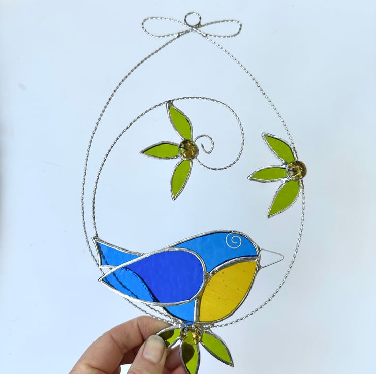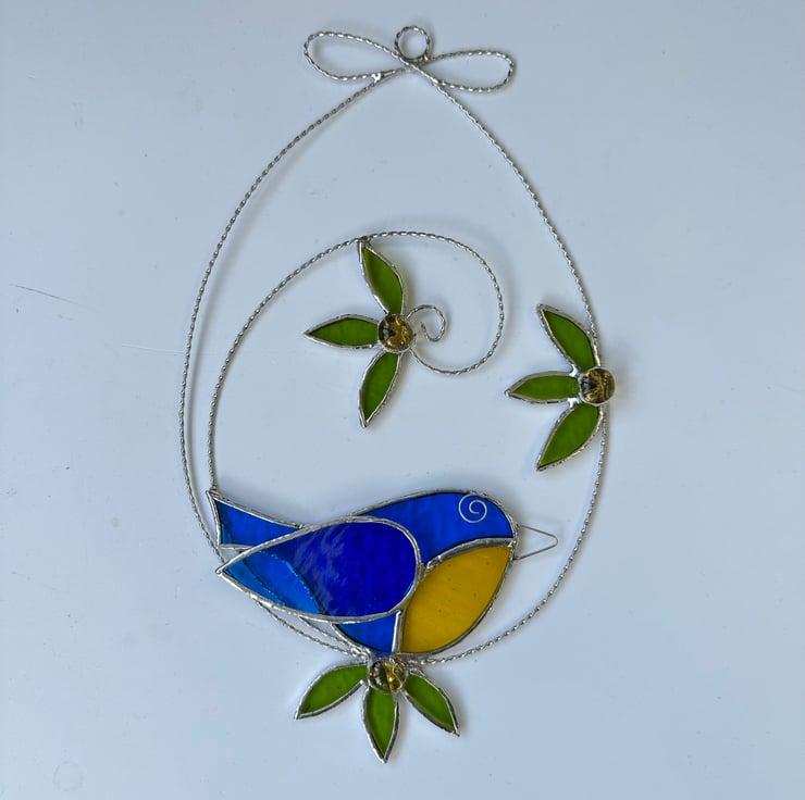 The glass used for the blue tit is a bright blue corella glass and yellow sea glass for the breast. I have used a lovely lime green corella glass and pale yellow small nuggets for the flowers. Twisted tinned wire has been used for the surround and scroll for the bird to sit on.