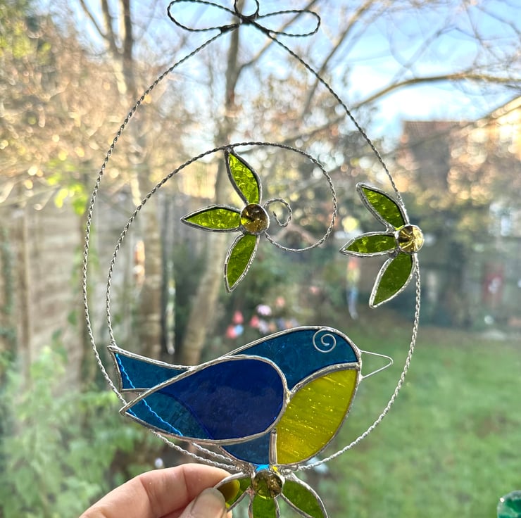 Blue tit suncatcher made in beautiful stained glass by Carole’s Glass.