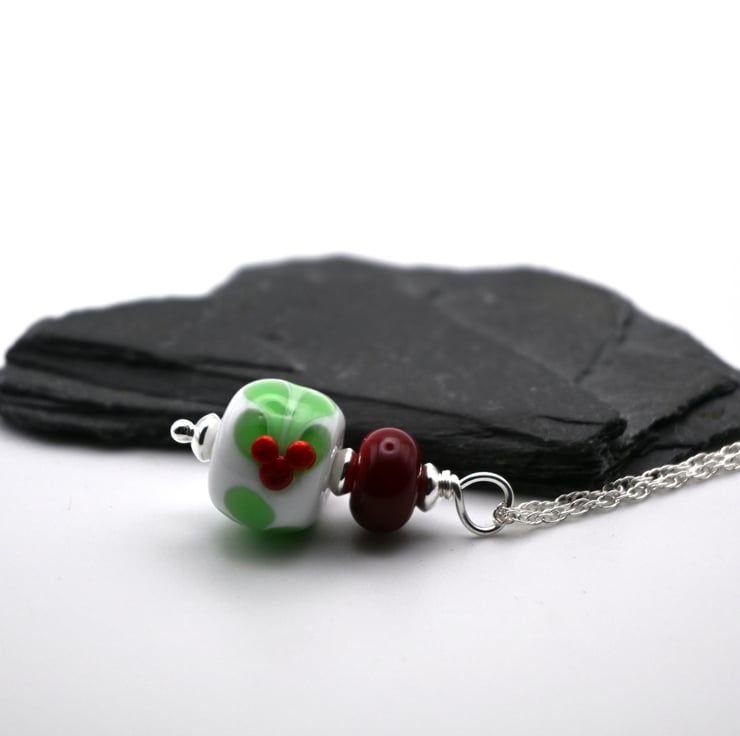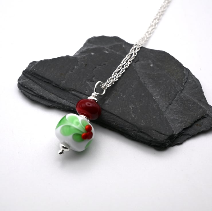 The pendant has been made with white and red glass and features a hand shaped holly leaf.