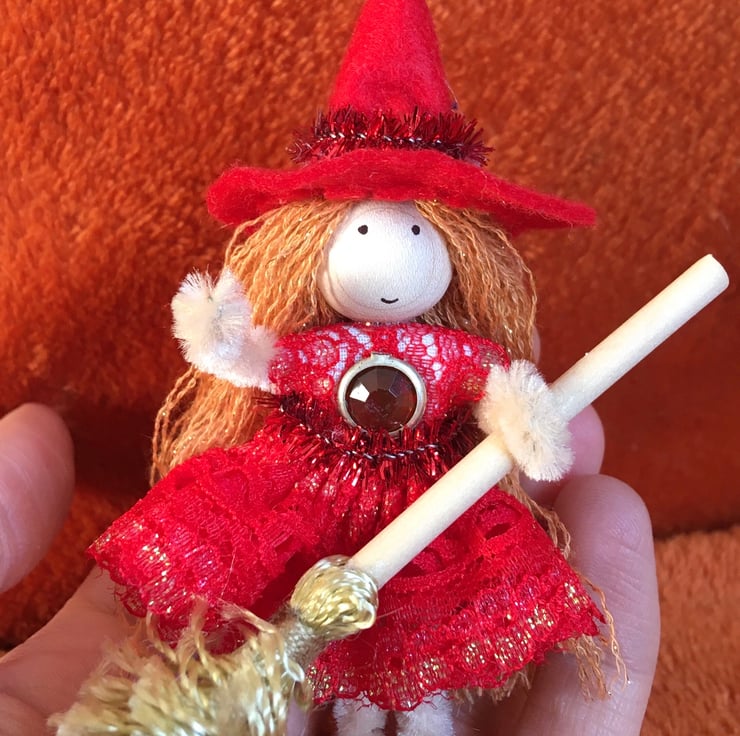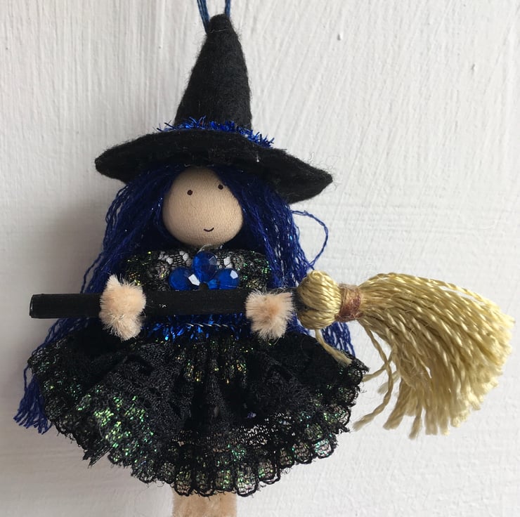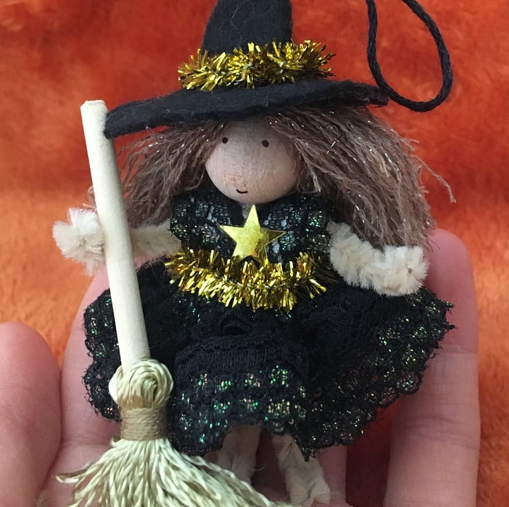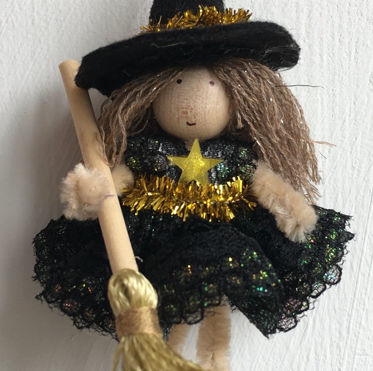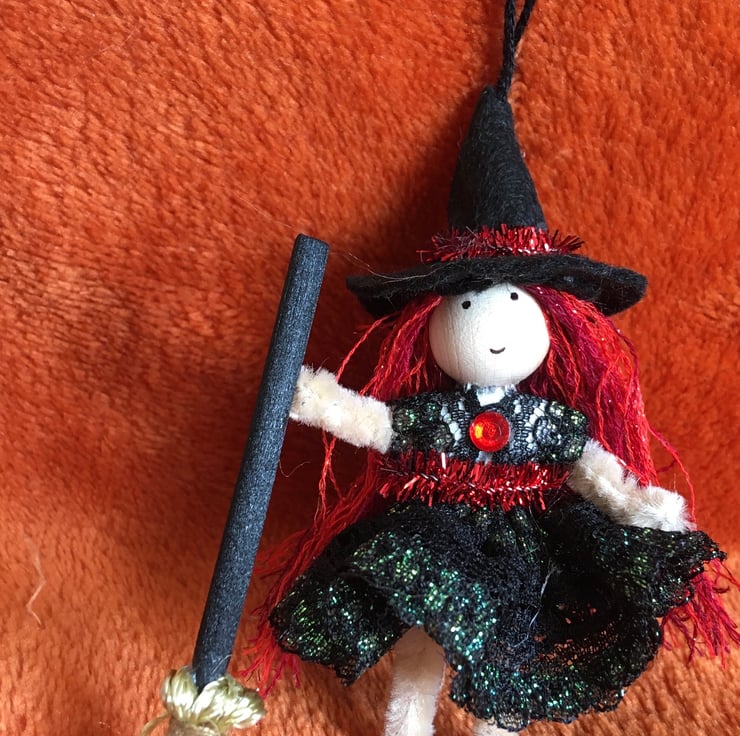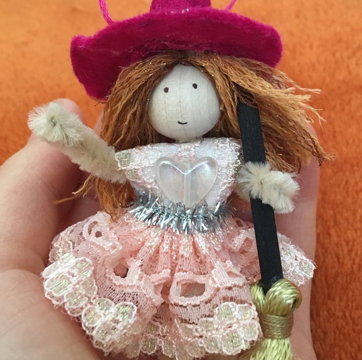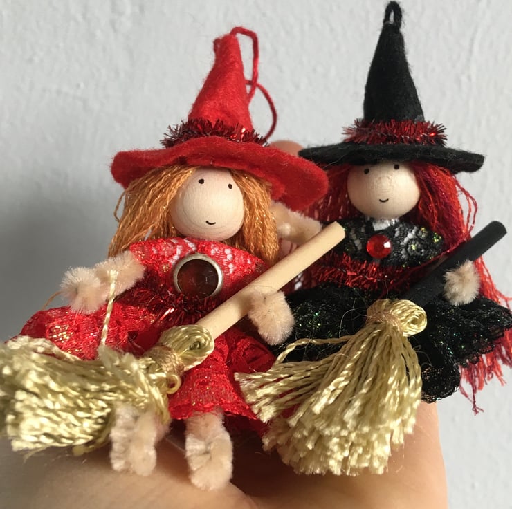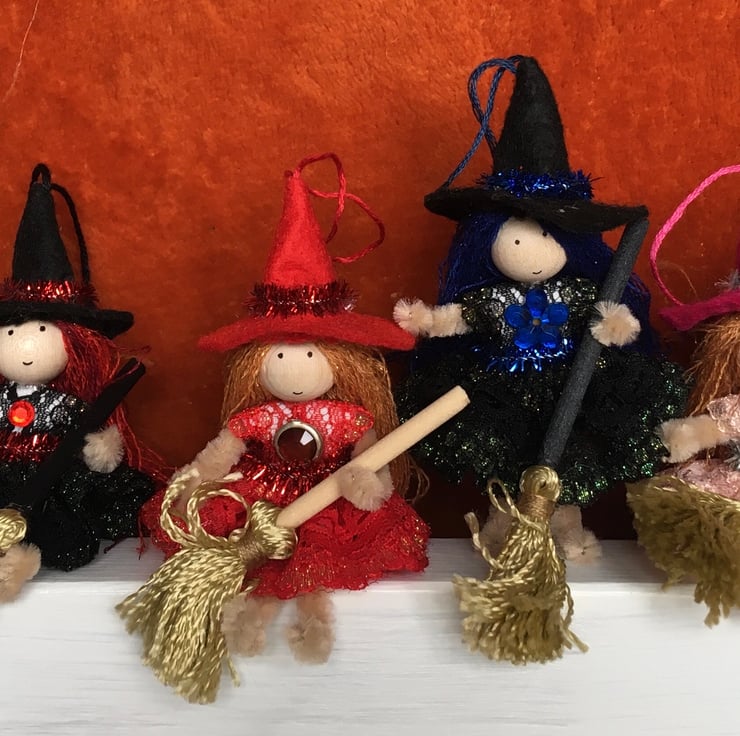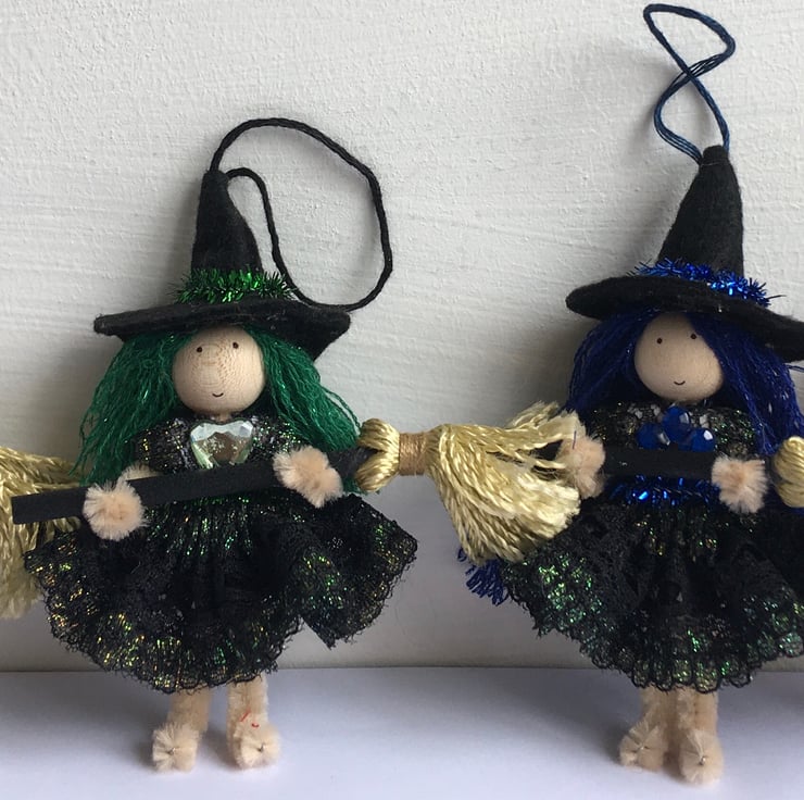 They have pipe cleaner bodies, with dresses made out of fabric and lace. The front of their dresses are embellished with a gem or sequin. They have felt hats with a sparkly pipe cleaner rim, and sparkly embroidery thread hair. There heads are made from wooden beads with hand drawn features. They have a loop so that they can be hung from places. Each little witch comes with a broomstick which is attached to their hands.