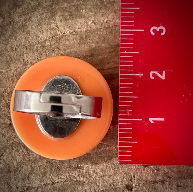 Cute little silver plated ring featuring a gorgeous mother of pearl button on top of a rich orange vintage button. The orange button measures approximately 25mm across, and the ring is adjustable.