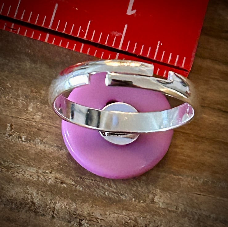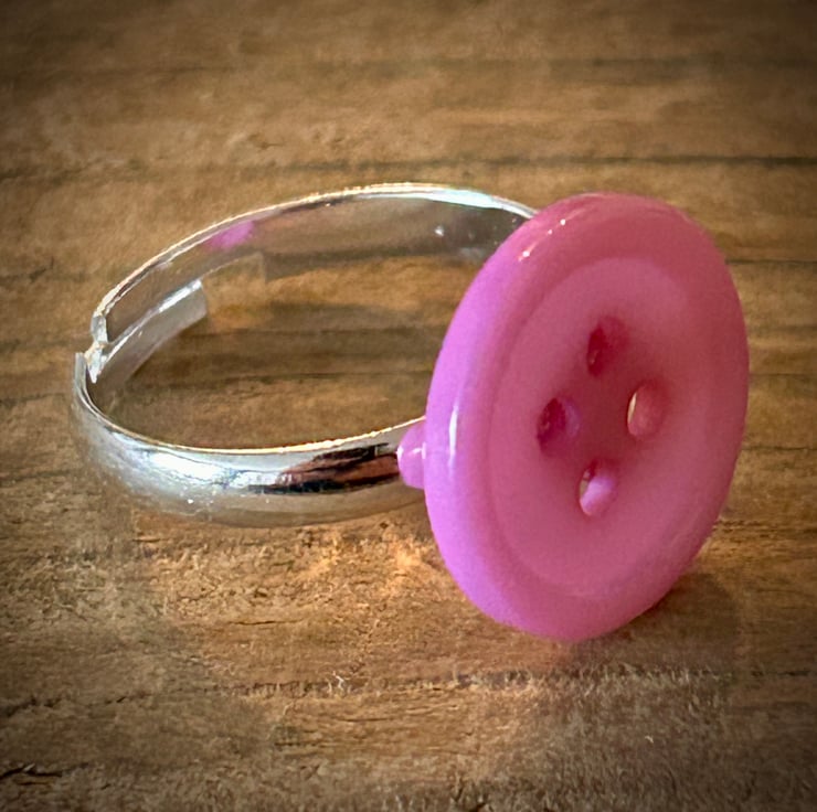 Cute little silver plated ring featuring a pretty little pink acrylic button. The button measures approximately 15mm across, and the ring is adjustable.
