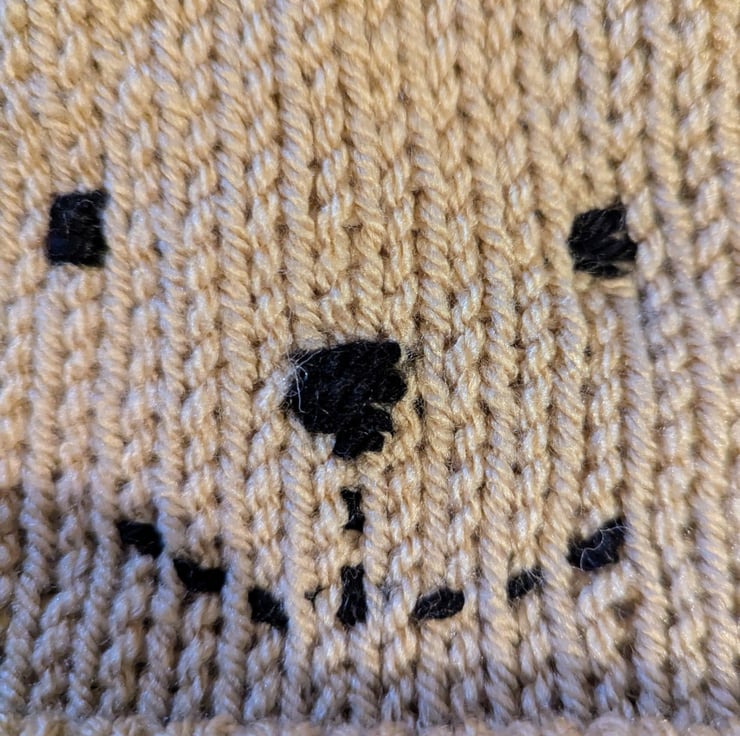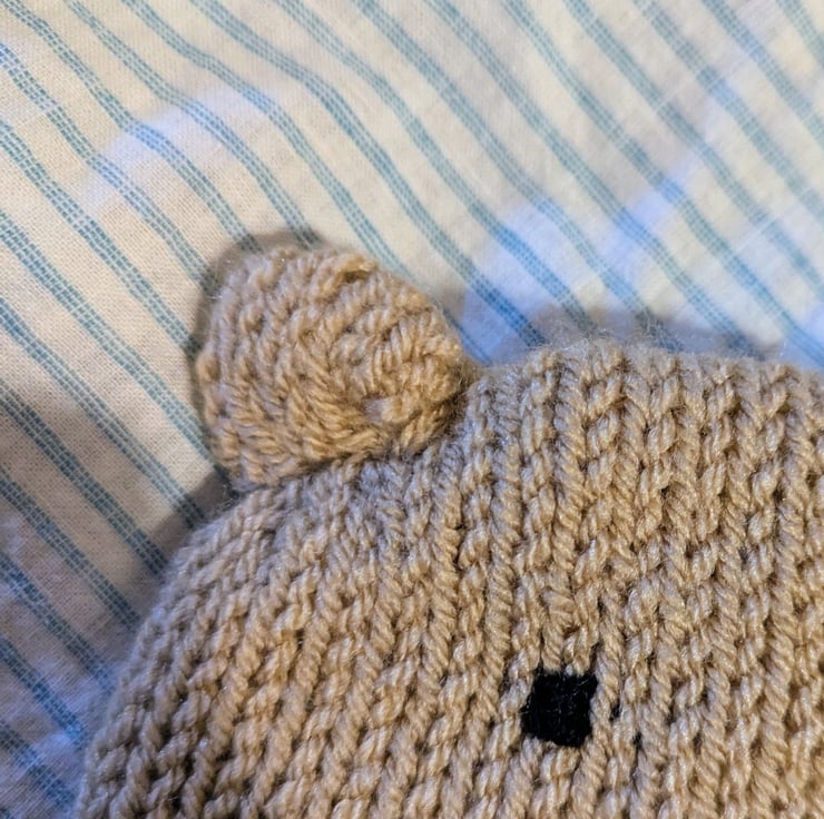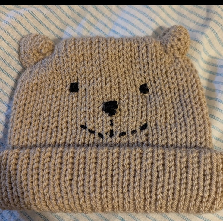Cute baby bear hand-knitted beanie hat made by myself. Embroidered features added. Yarn is super soft for baby's skin so no irritation.