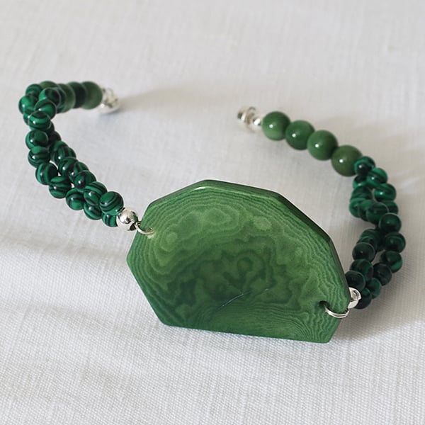 Here I have used a beautiful green piece, complimented by Malachite beads strung on Sterling Silver wire and twisted in two spirals.
