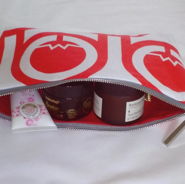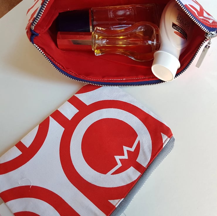 This listing is for a set of 2 red and white zipped bags in very limited but thoroughly moden design canvas. These make up bags and zipped pouches are so versatile and handy for keeping all your items organised such as make up, toiletries, money, phone and more so that you won't lose them in your main bag.