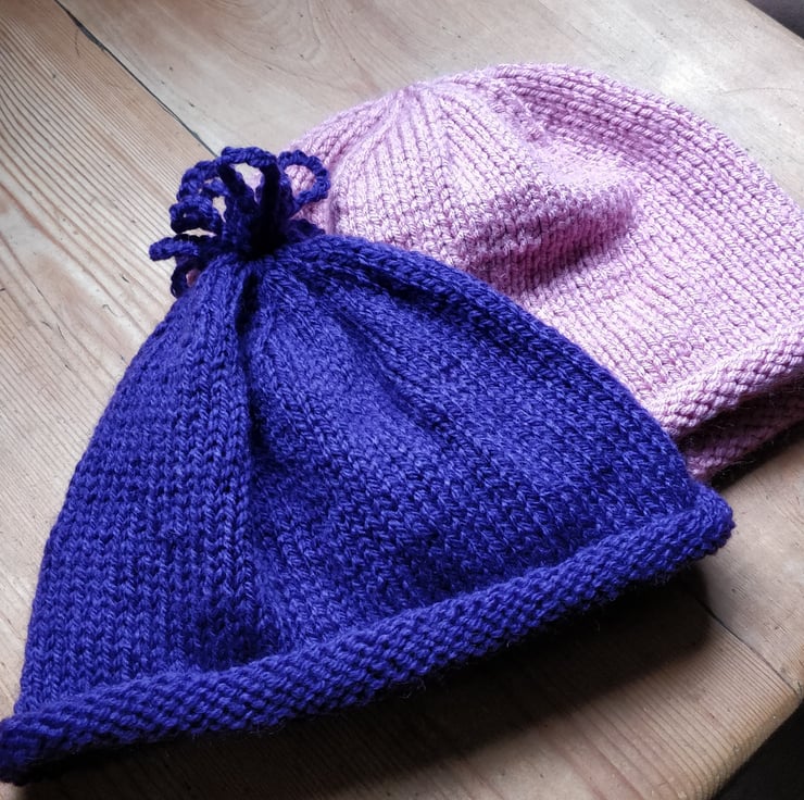 Cute handknit purple beany hand knit to fit a medium sized head.