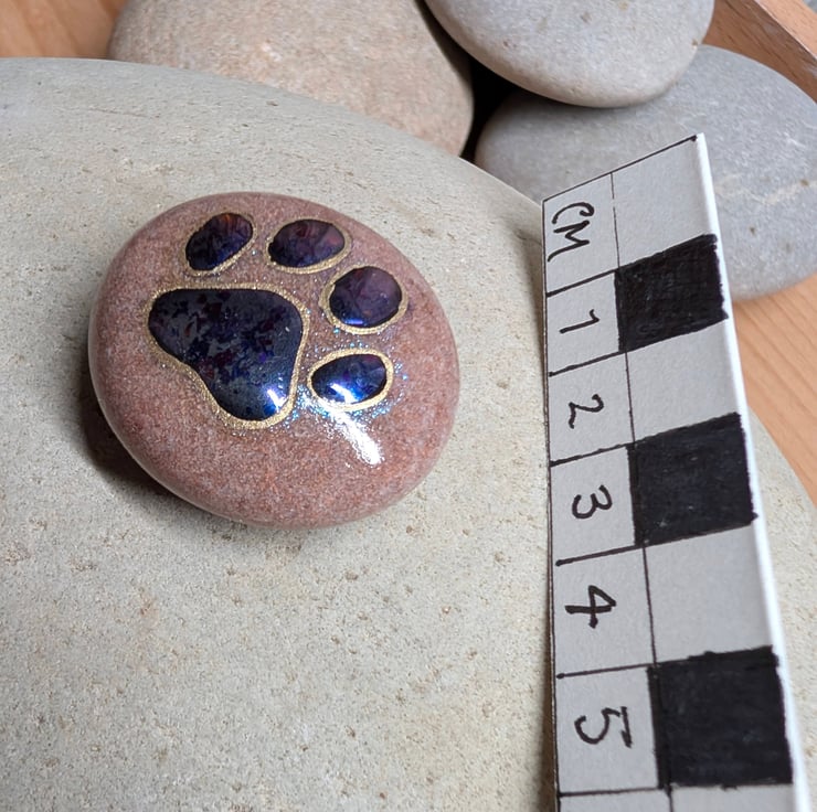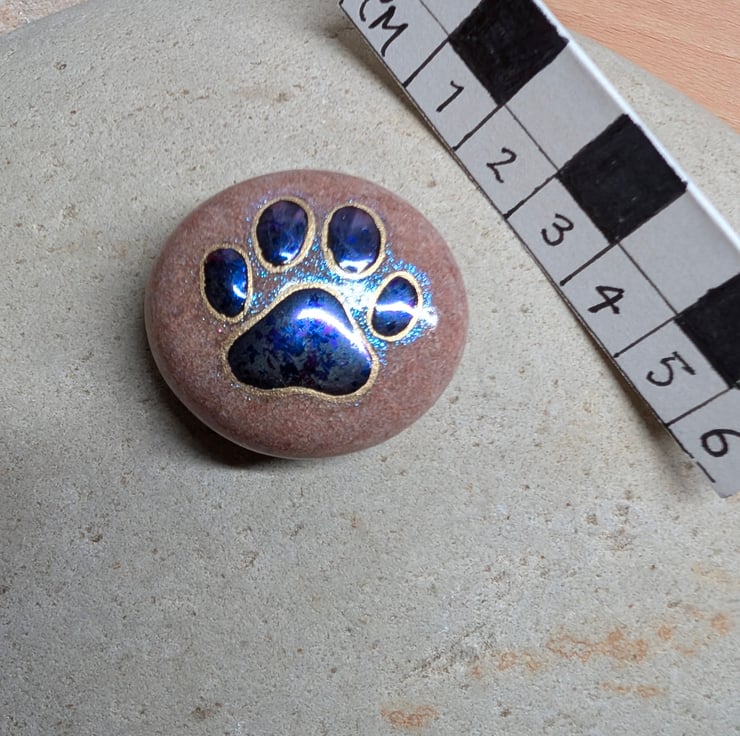 A lovely little smooth pebble featuring a hand painted paw design. By skilfully combining the use of UV nail gel and chrome nail powder, a slightly raised, shiny purple, paw design is created. The whole pebble is then finished and sealed with varnish for a smooth glossy look.