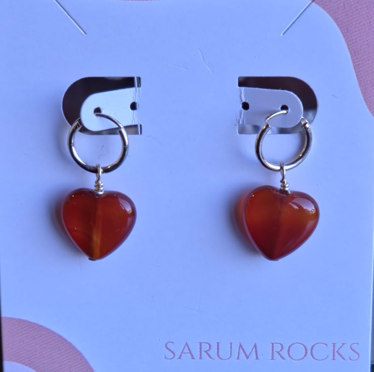 Our carnelian heart measures 1 centimeter in length and is presented on these charming sterling silver shepherd crook earrings. You can also choose the 'Huggie' hoop earring if you prefer. The earrings will be presented in a small sealed clear bag and wrappped inside this gift bag.