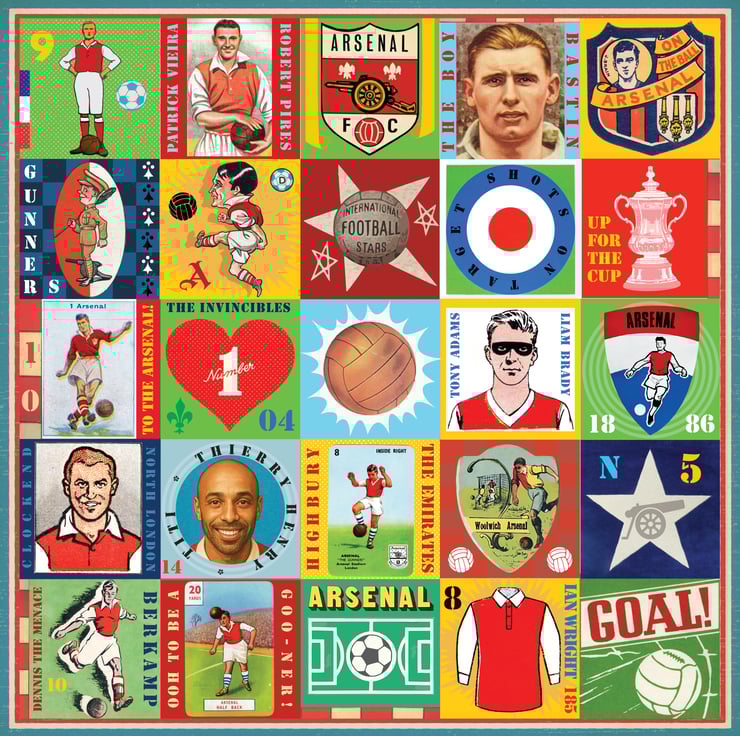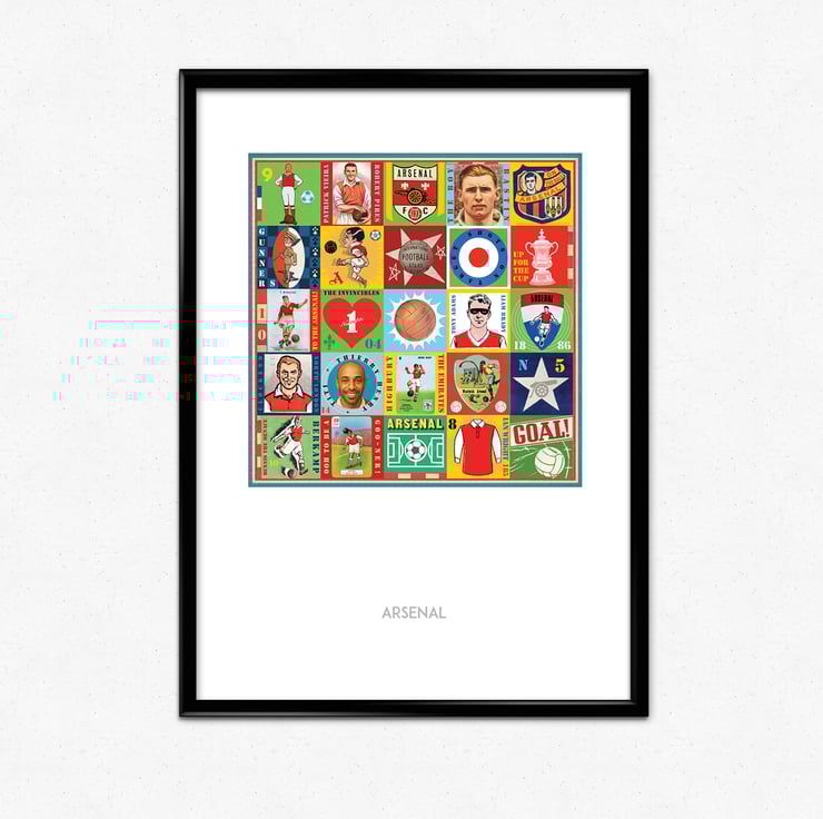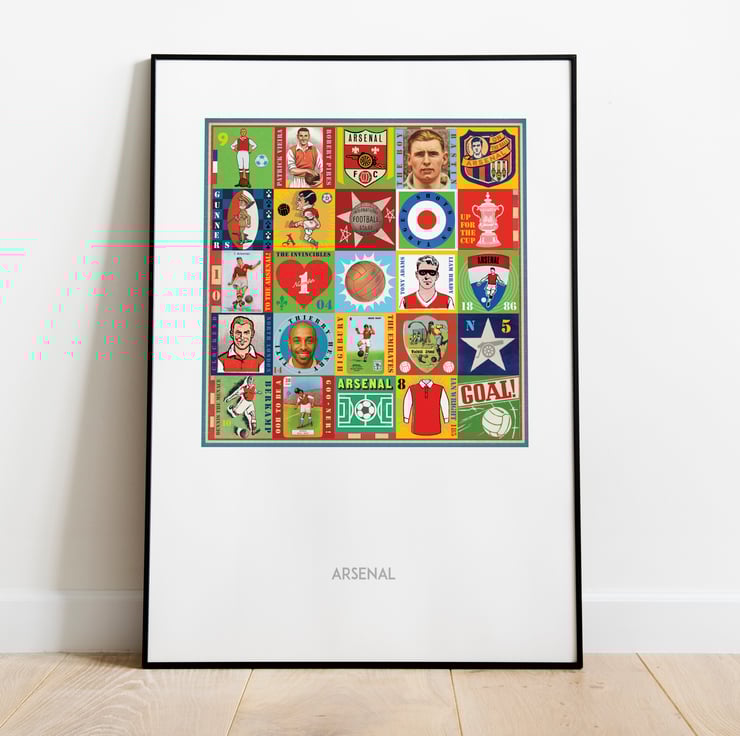 Celebrate the proud history of Arsenal with this unique Pop Art Print, featuring vintage images & memorabilia capturing and celebrating the rich heritage, history and Club legends. This print is the perfect tribute for any true Arsenal supporter.