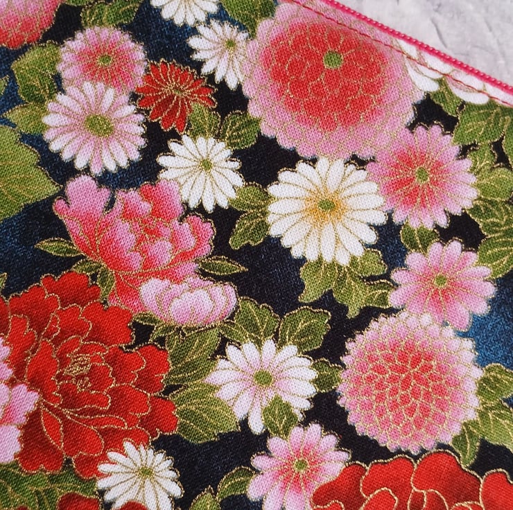 A very pretty zip top storage bag in a lovely Japanese style print of paeonies, chrysanthemums and daisies, in shades of red, pink and white, with green leaves and metallic gold highlights.