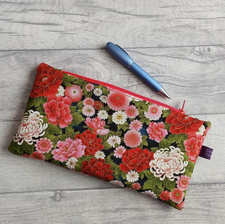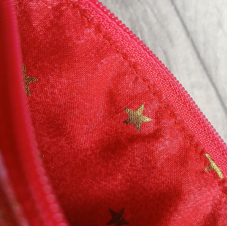 I've lined it with a coordinating pinky red cotton printed with gold stars, with a matching pinky red zip. A layer of fusible fleece interfacing between the outer and lining fabrics gives it some structure and will help protect the contents. Measures 25 cm long and 12.5 cm high, so ideal for make up or as a pencil case.