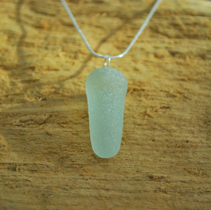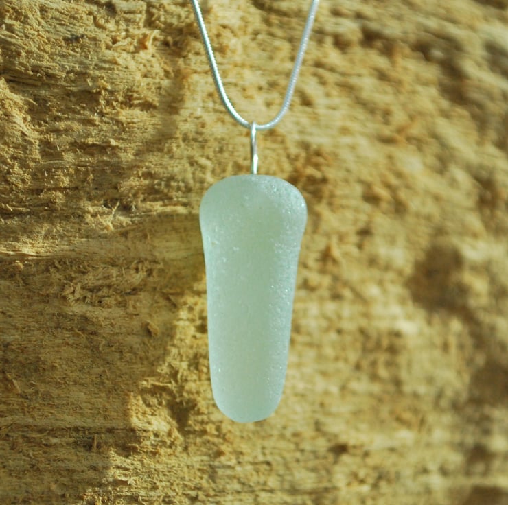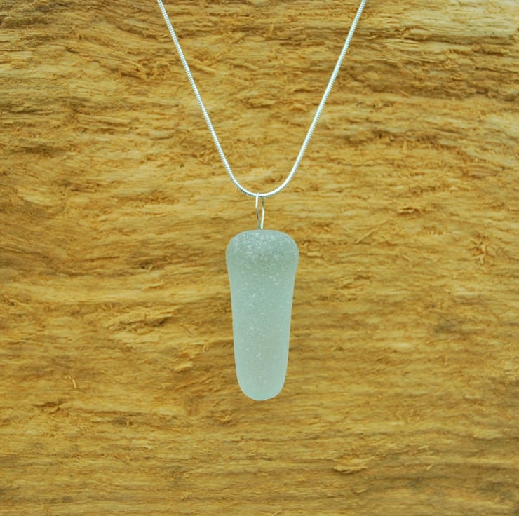 The piece of sea glass we've used to make this pendant is extremely unusual. It is part of an old glass bottle stopper, and is wonderfully formed. The bottle stopper started with two parts - the flat top and the stem of the stopper. The stem must have broken off the flat part many years ago, because it has become a perfect piece of sea glass. To preserve the simple beauty of the glass we've pegged it and hung it from a stering silver snake chain.