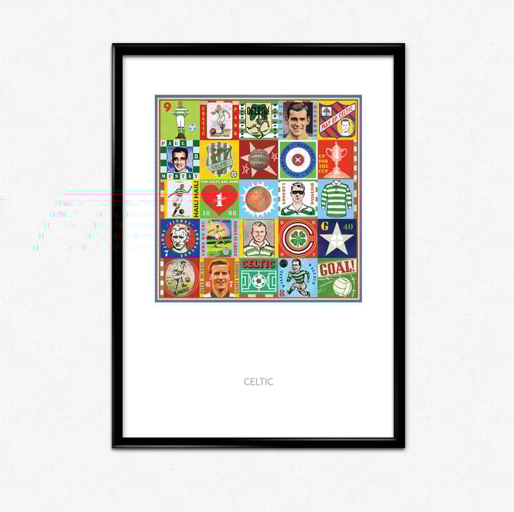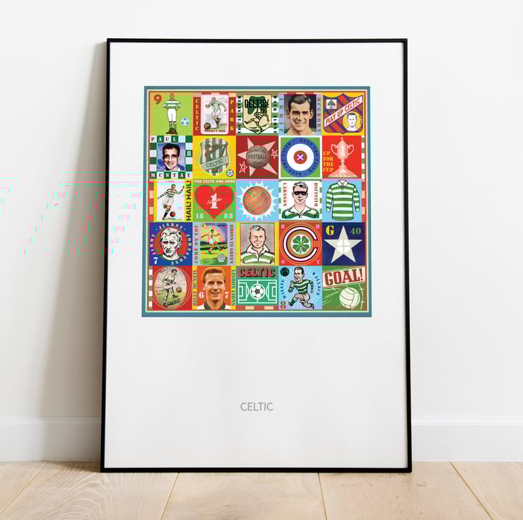 Celebrate the proud history of Celtic with this unique Pop Art Print, featuring vintage images & memorabilia capturing and celebrating the rich heritage, history and Club legends. This print is the perfect tribute for any true Celtic FC supporter.