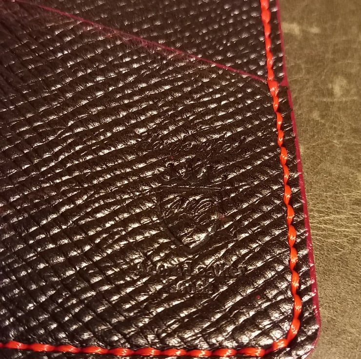 Red stitching and red edges on a black leather.