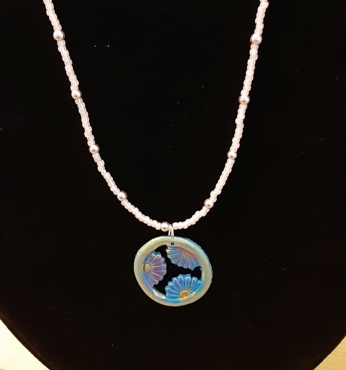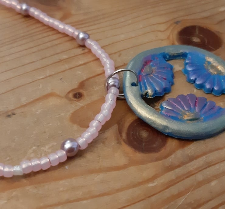 This floral pendant necklace is made with polymer clay and is coloured with a layer of mica powder. The pendant is on a beaded necklace with a lobster clasp.
