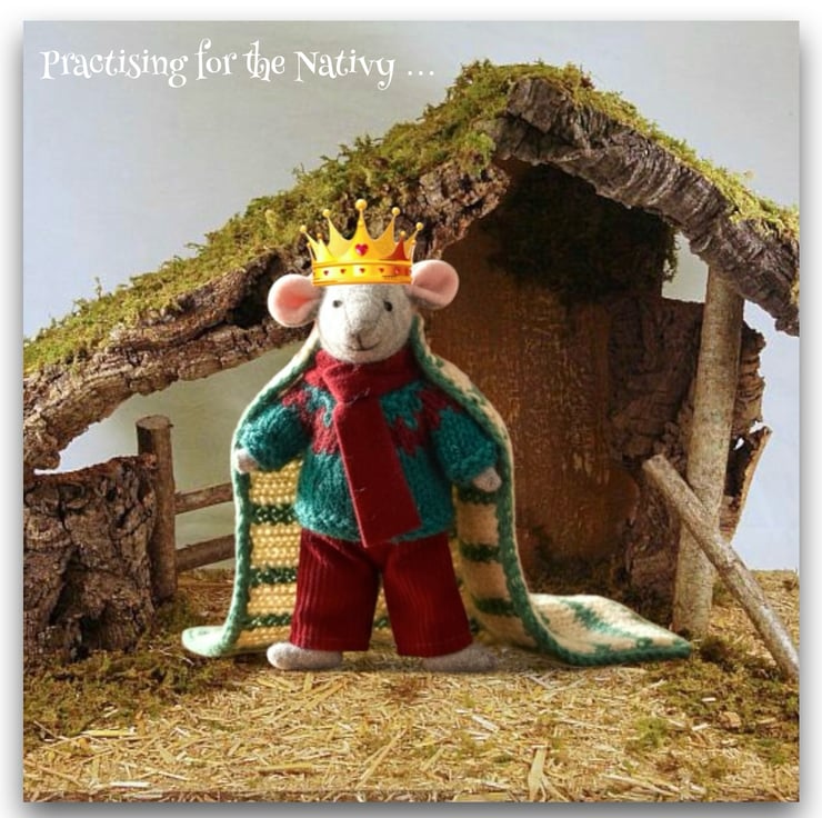 Wilfred Woodruff, in his burgundy corduroy trousers, turquoise green and burgundy jumper and matching scarf, is a Pip Squeak - a young Little Nipper. Little Nippers are tiny wood mice who live in a maze of tunnels underneath the barn at Mulberry Farm. All of the Little Nippers are named after herbs and meadow flowers. Pip Squeaks are 11cm tall. Clothes made especially to fit them are also available in my shop.