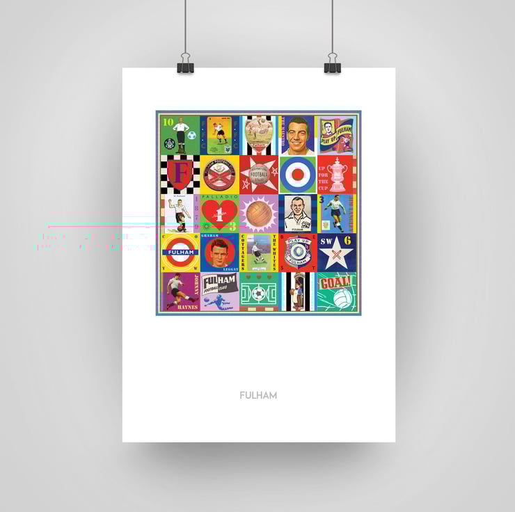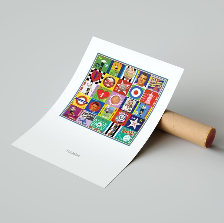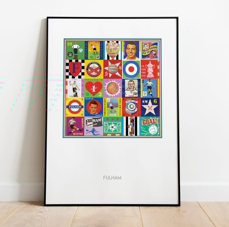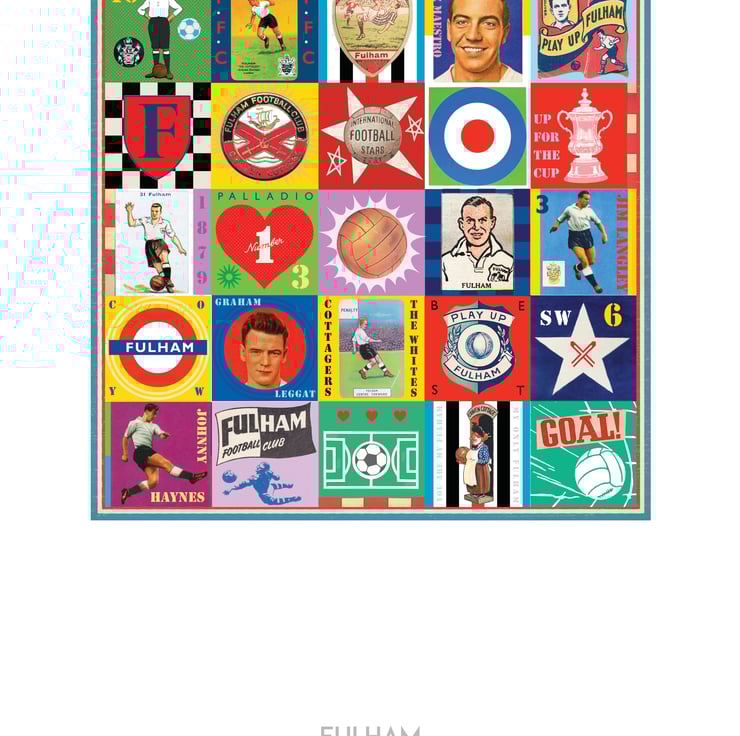 Celebrate the proud history of Fulham with this unique Pop Art Print, featuring vintage images & memorabilia capturing and celebrating the rich heritage, history and Club legends. This print is the perfect tribute for any true Fulham supporter.