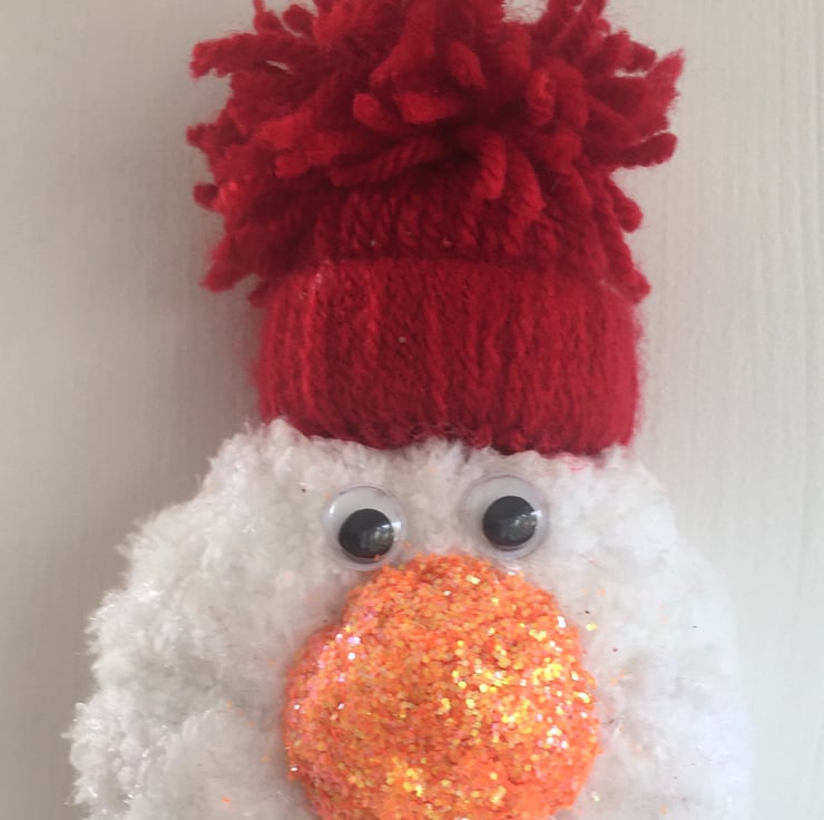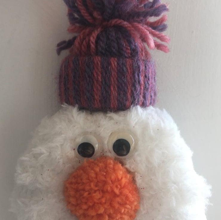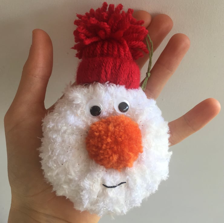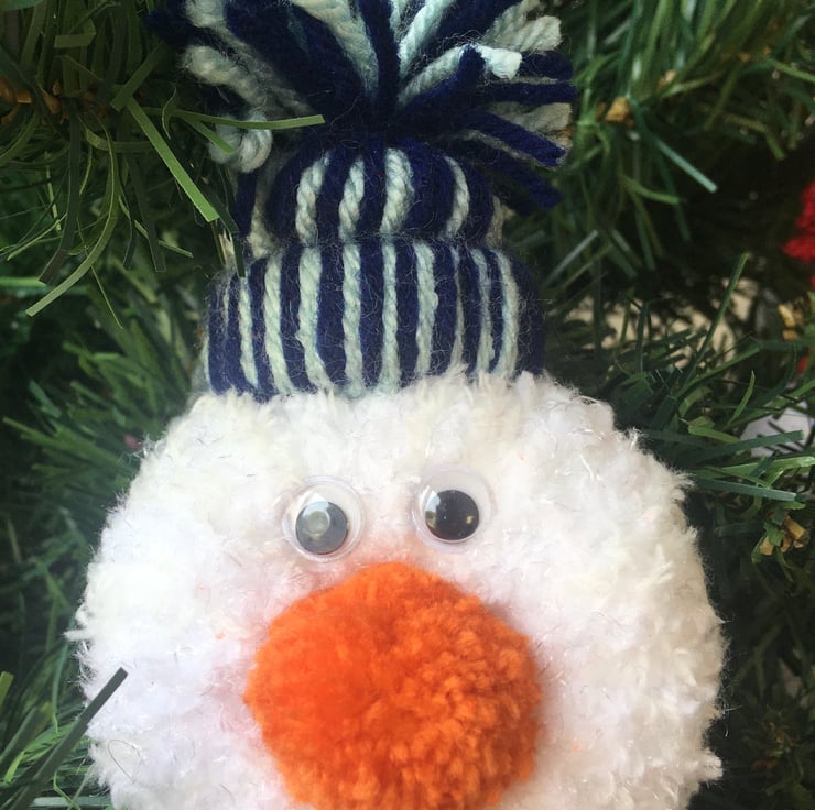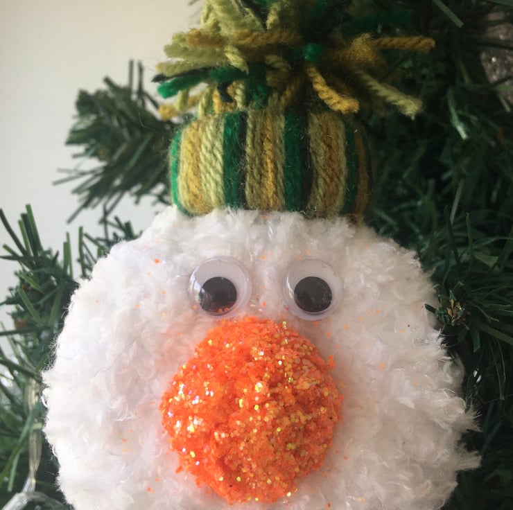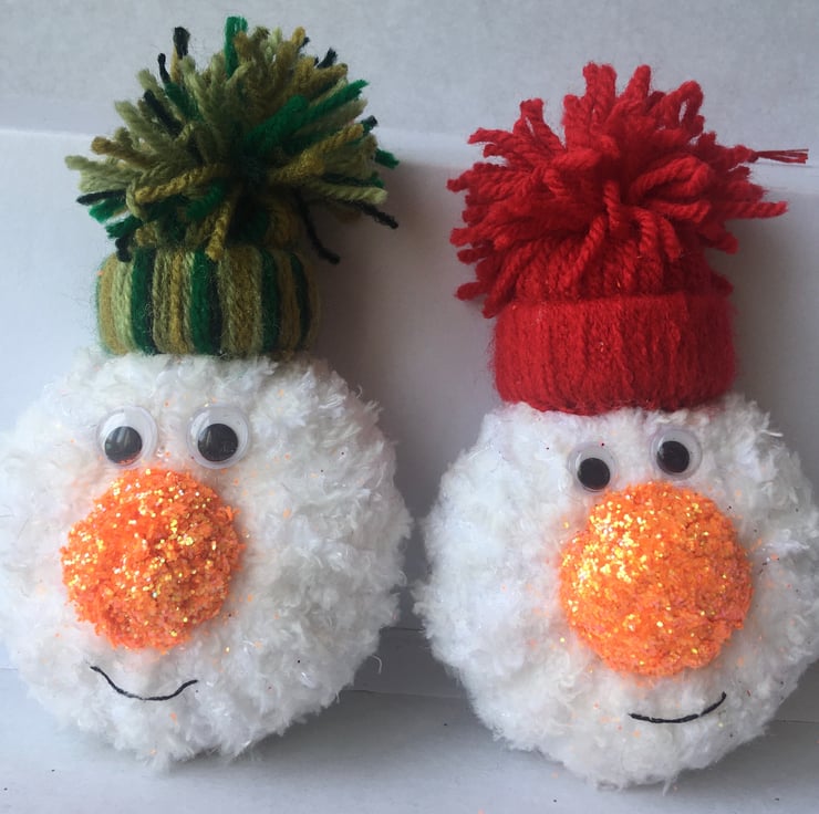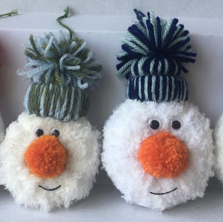 They are made, by wrapping wool around curtain rings foraged from charity shops. A pom pom is made for the nose using a tiny pom pom maker. Some of the pom poms are covered in glitter to add some Christmas sparkle to the decoration, some of the pom poms do not have glitter. Googly eyes are added and then embroidery thread for the mouth. A fluffy pom pom hat is made for each snowman using recycled card and wool.