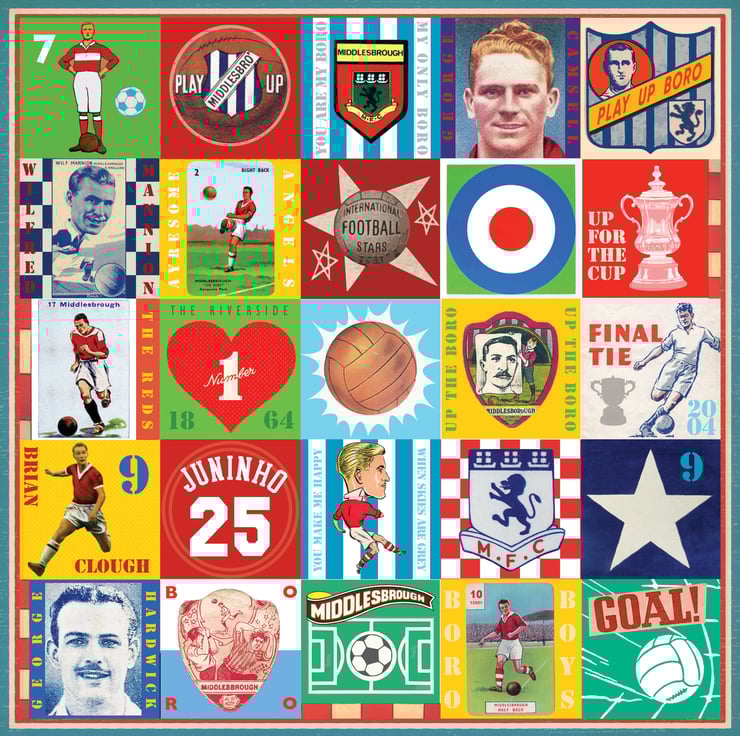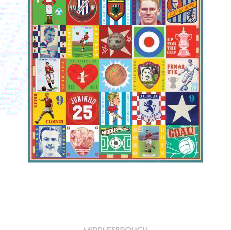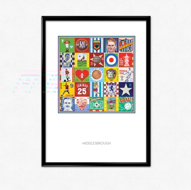 Celebrate the proud history of Middlesbrough with this unique Pop Art Print, featuring vintage images & memorabilia capturing and celebrating the rich heritage, history and Club legends. This print is the perfect tribute for any true Boro supporter.